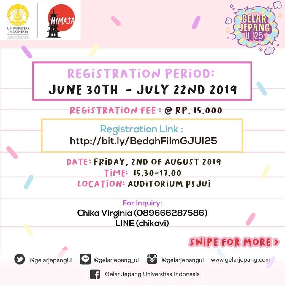 Acara ini akan diselenggarakan pada Jumat, 2 Agustus 2019 dalam perhelatan Gelar Jepang Universitas Indonesia 25 di Pusat Studi Jepang Universitas Indonesia.