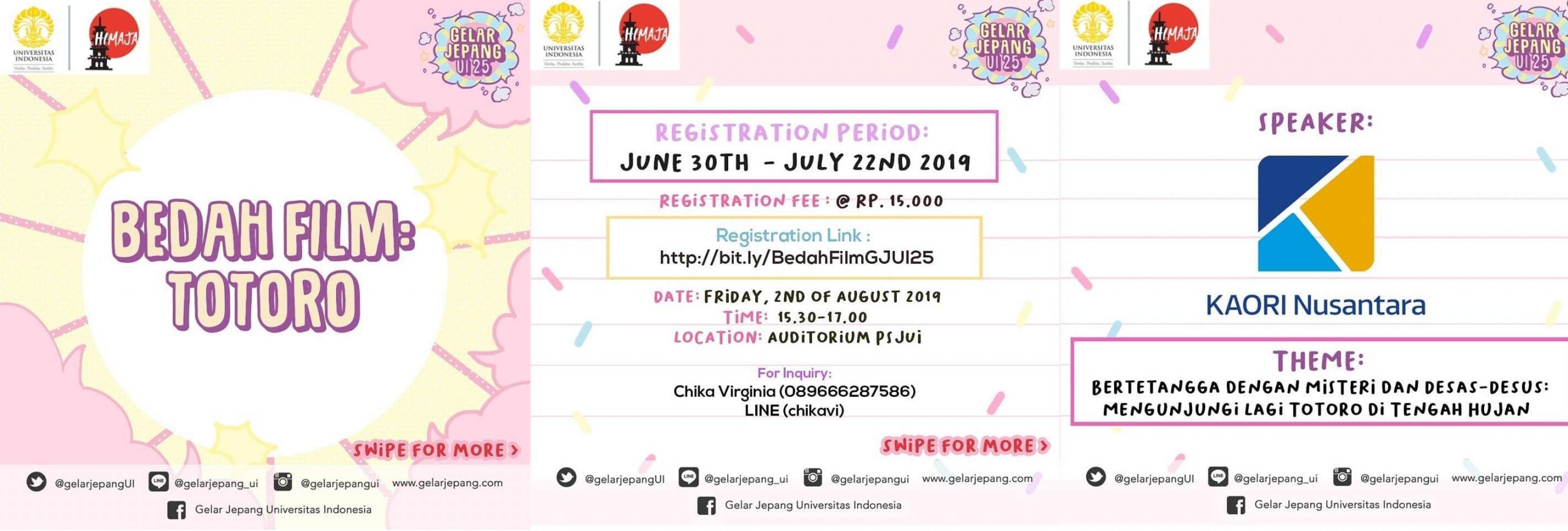 Apa sebenarnya yang menarik dari sosok Totoro? Ada cerita apa di balik film My Neighbor Totoro, hingga ia menjadi salah satu film Studio Ghibli paling ikonik? Gelar Jepang Universitas Indonesia (GJUI) bekerjasama dengan KAORI Nusantara akan menggelar bedah film My Neighbor Totoro dengan tema “Bertetangga dengan Misteri dan Desas-Desus: Mengunjungi Lagi Totoro di Tengah Hutan”.