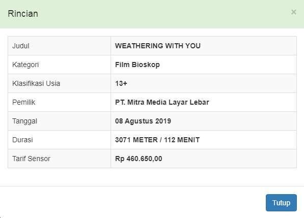 Sebagaimana telah diberitakan sebelumnya, film anime terbaru karya sutradara Makoto Shinkai yang berjudul Tenki no Ko atau Weathering With You akan diputar di Indonesia. Rencananya Weathering With You akan diputar di Indonesia mulai 21 Agustus 2019, hanya terpaut sebulan dari tanggal perilisannya di Jepang. Kini berdasarkan data dari Lembaga Sensor Film (LSF), film ini telah resmi lulus sensor dan siap beredar di Indonesia.