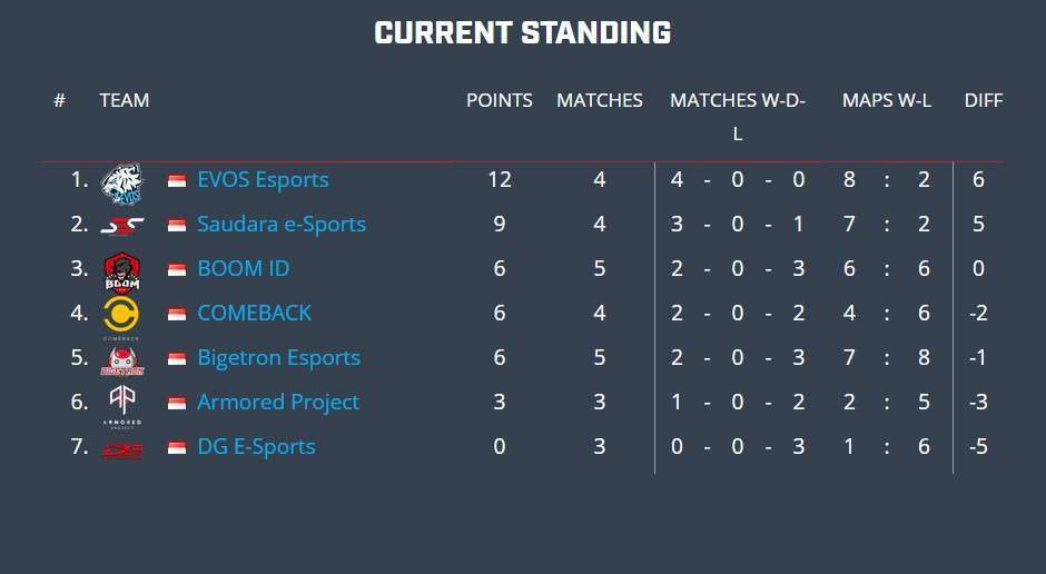 Dari semua tim, EVOS Esports adalah salah satu tim yang minim perombakan roster. Sang juara bertahan ASL hanya menambahkan Gilang “Fall” Dwi Fallah saja sebagai midlaner. Terbukti, roster ini menghasilkan performa yang stabil. Mereka berhasil kokohkan posisinya di puncak klasemen dengan perolehan 12 poin. Melawan BOOM.ID pada pekan ini, EVOS hanya terpeleset satu kali. Namun setelahnya, mereka berhasil membalikkan keadaan dan memenangkan pertandingan dengan skor 2-1.