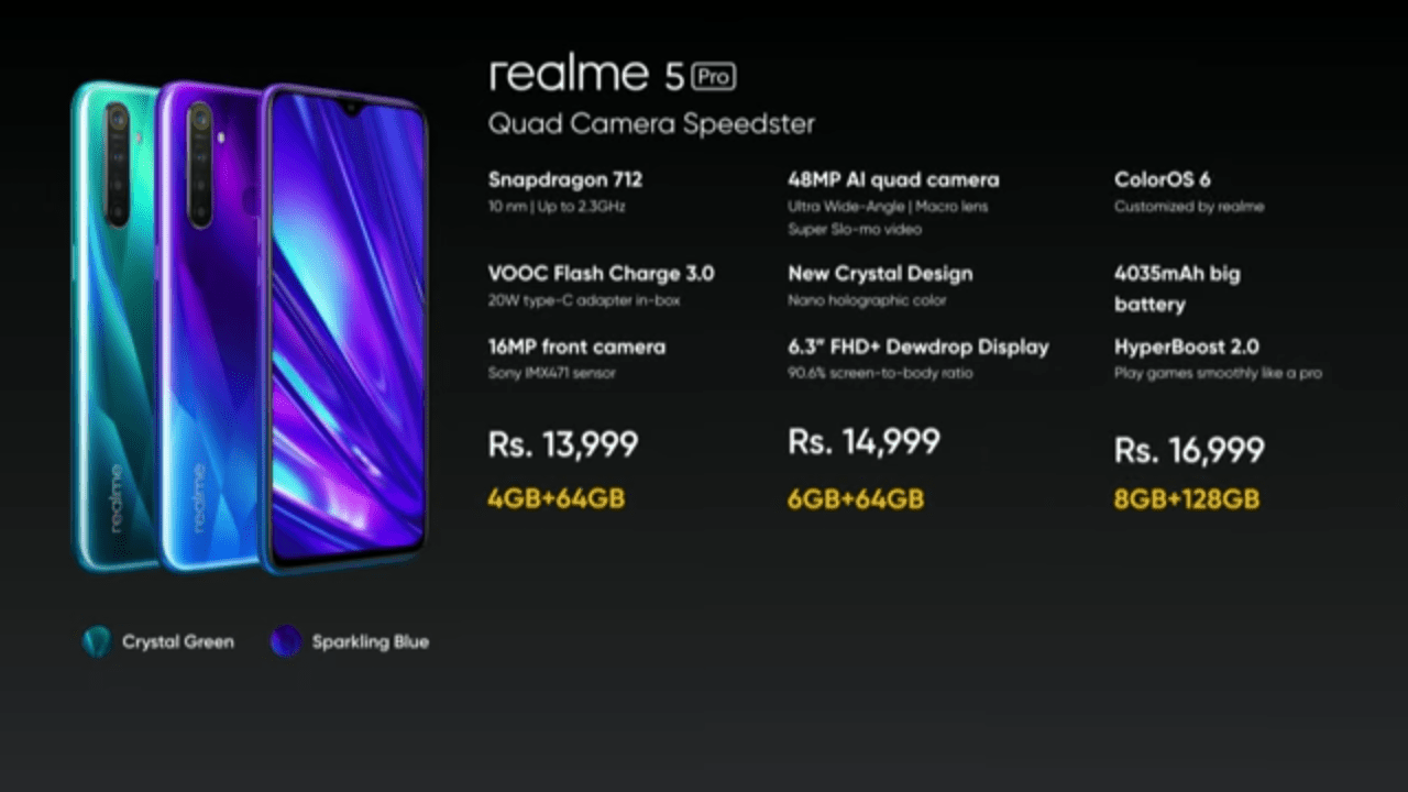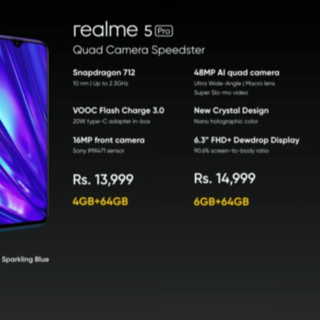 Sementara itu, Realme 5 Pro yang mengusung “Quad Camera Speedster” dibekali dengan 48 MP AI Quad Camera yang menggunakan sensor Sony IMX 586 dengan aperture f/1.79 yang ditambah dengan 8 MP Lensa Wide-Angle, 2 MP Lensa Potrait dan 2 MP 4cm Macro Lens, untuk kamera depan dibekali 16 MP dengan sensor Sony IMX 471 f/2.0 large aperture. Untuk sektor performa, Realme 5 Pro dibekali processor Octa Core yaitu Qualcomm Snapdragon 712 AIE dengan GPU Adreno 616 sebesar 2.3GHz clock speed yang diperkuat dengan teknologi UFS 2.1 ROM. Di sektor baterai, Realme 5 Pro menanamkan baterai Li-Po sebesar 4035 mAh yang menggunakan teknologi VOOC fast charge 3.0 mampu mengisi baterai dengan cepat selama 80 menit dari 0 ke 100%, dan terlebih lagi sudah mendukung USB Type-C. Di sisi layarnya dibekali dengan layar 6,3 Inch FHD+ Dewdrop Full Screen yang mempunyai ratio dari layar ke body sebesar 90.6% yang dilindungi oleh Corning Gorilla Glass 3+.