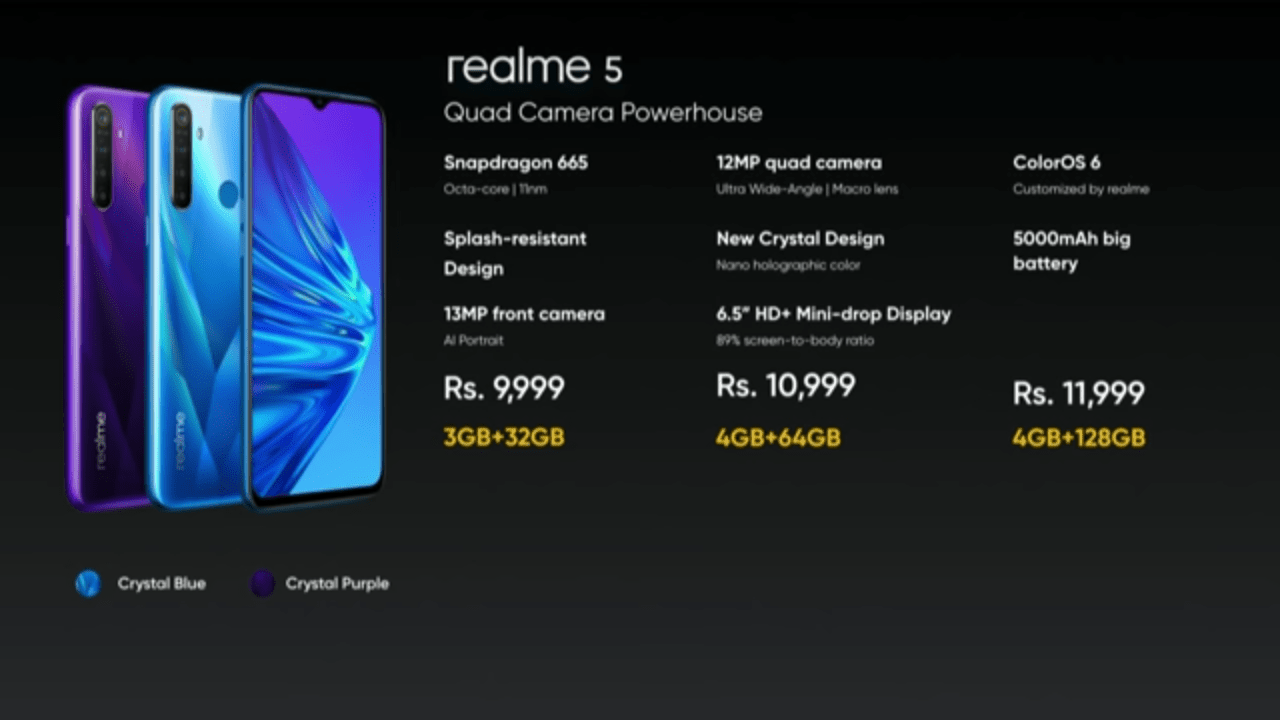 Realme 5 yang mengusung “Quad Camera Powerhouse” dibekali dengan kamera 12 Mega Pixel dengan teknologi AI Quad Camera, yaitu Lensa Utama 12 MP, lensa Wide-Angle sebesar 8 MP, lensa Potrait sebesar 2 MP dan 4 cm distance Macro Lens Camera sebesar 2 MP, dan kamera depan sebesar 13 MP untuk ber-selfie. Tidak hanya itu, Realme 5 diberi dapur pacu Octa Core dari Qualcomm yaitu chipset Snapdragon 665 AIE dengan GPU Adreno 610 yang terbaik di seri ke 6 dari processor Snapdragon sebesar 2.0 GHz Clock speed, Realme 5 juga menyisipkan kapasitas baterai yang sangat besar yaitu 5000 mAh yang bisa bertahan lama ketimbang rivalnya, Samsung M20 yang mempunyai kapasitas baterai yang sama. Realme 5 juga mempunyai layar sebesar 6,5 inch Fullscreen dengan resolusi 720 x 1600 pixels, 20:9 ratio (~269 ppi density) yang mempunyai tampilan mini-drop notch dengan layar yang telah dibekali Corning Gorilla Glass 3+.
