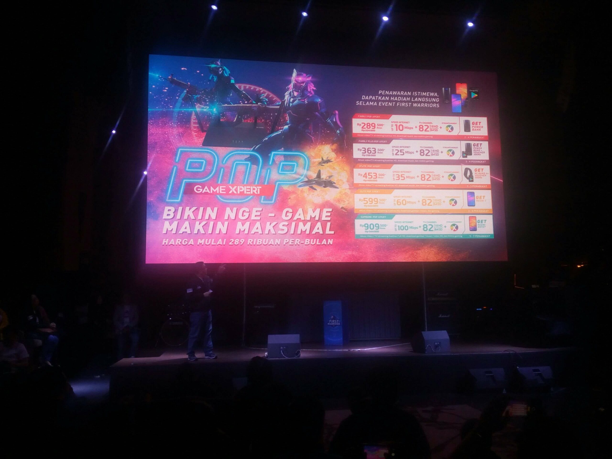 Untuk mendukung acara FIRST WARRIORS, First Media juga meluncurkan paket POP Game Xpert untuk para gamer di Indonesia, paket ini terdiri dari High Speed Unlimited Broadband Internet, High End Game Router dan Best Quality Channels yang di bundling dengan beragam merchandise menarik lainnya seperti smartphone, smartwatch, dan game voucher dan paket POP Game Xpert dimulai dengan harga Rp 289.500 (Sebelum PPN).