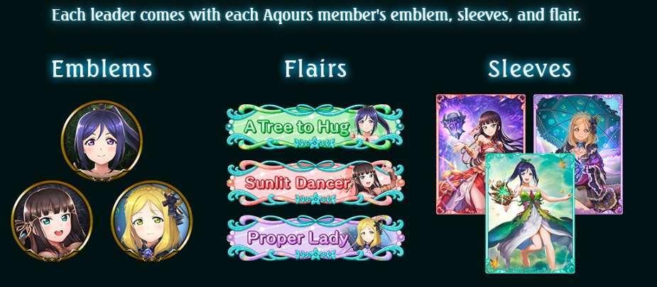 Seperti biasa, pemain bisa mendapatkan 1 paket leader yang berisikan, Leader, Sleeve, Flair dan Emblem ekslusif seharga 500 crystal. Ataupun membeli seluruh Leader tersebut dengan paket yang berisikan semua leader Love Live School Idol Festival dengan bonus Sleeve ekslusif dengan harga 3600 crystal, lebih murah daripada beli satuan. Dan sekarang terdapat promo pembelian Crystalnya yaitu Autumn Crystal Sale, 3600 Crystal hanya dengan $54.99 atau setara dengan 800.000 IDR. Leader tersebut bisa dibeli sampai tanggal 25 September 2019.