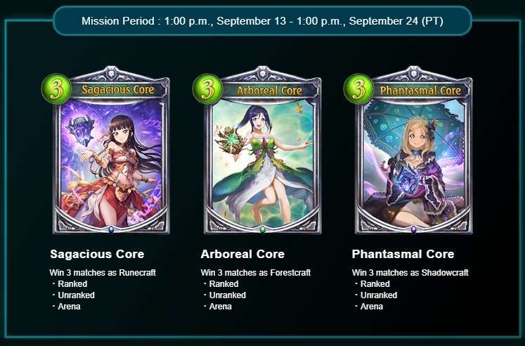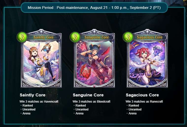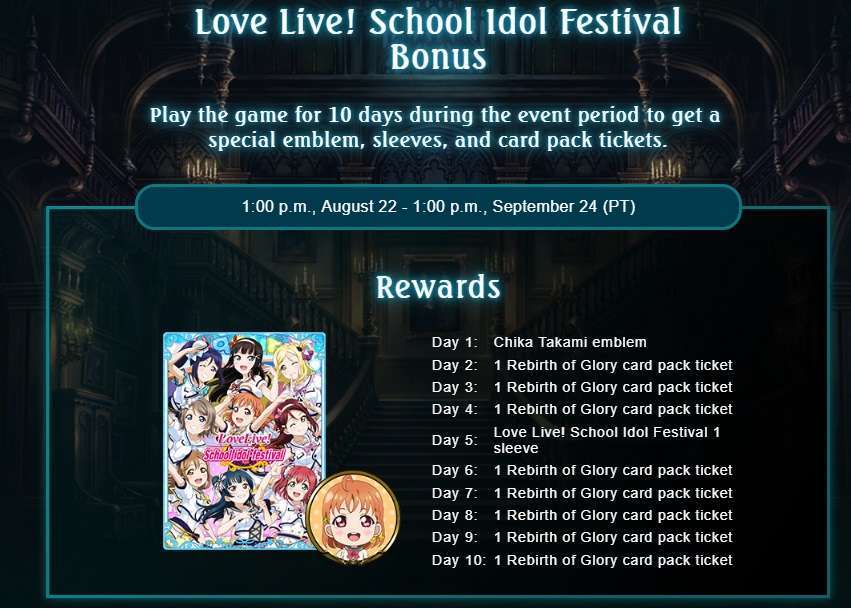 Selain menghadirkan Leader baru, ada juga event yang menarik pada update kali ini. Yang pertama, hanya dengan menyelesaikan misi, pemain bisa mendapatkan kartu eksklusif Love Live! School Idol Festival (Animated). Dan yang kedua adalah, cukup dengan login Shadowverse setiap hari, bisa mendapatkan emblem, tiket Rebellion of Glory, dan Sleeve secara gratis. Dan untuk kedua misi tersebut tersedia sampai tanggal 24 September 2019.