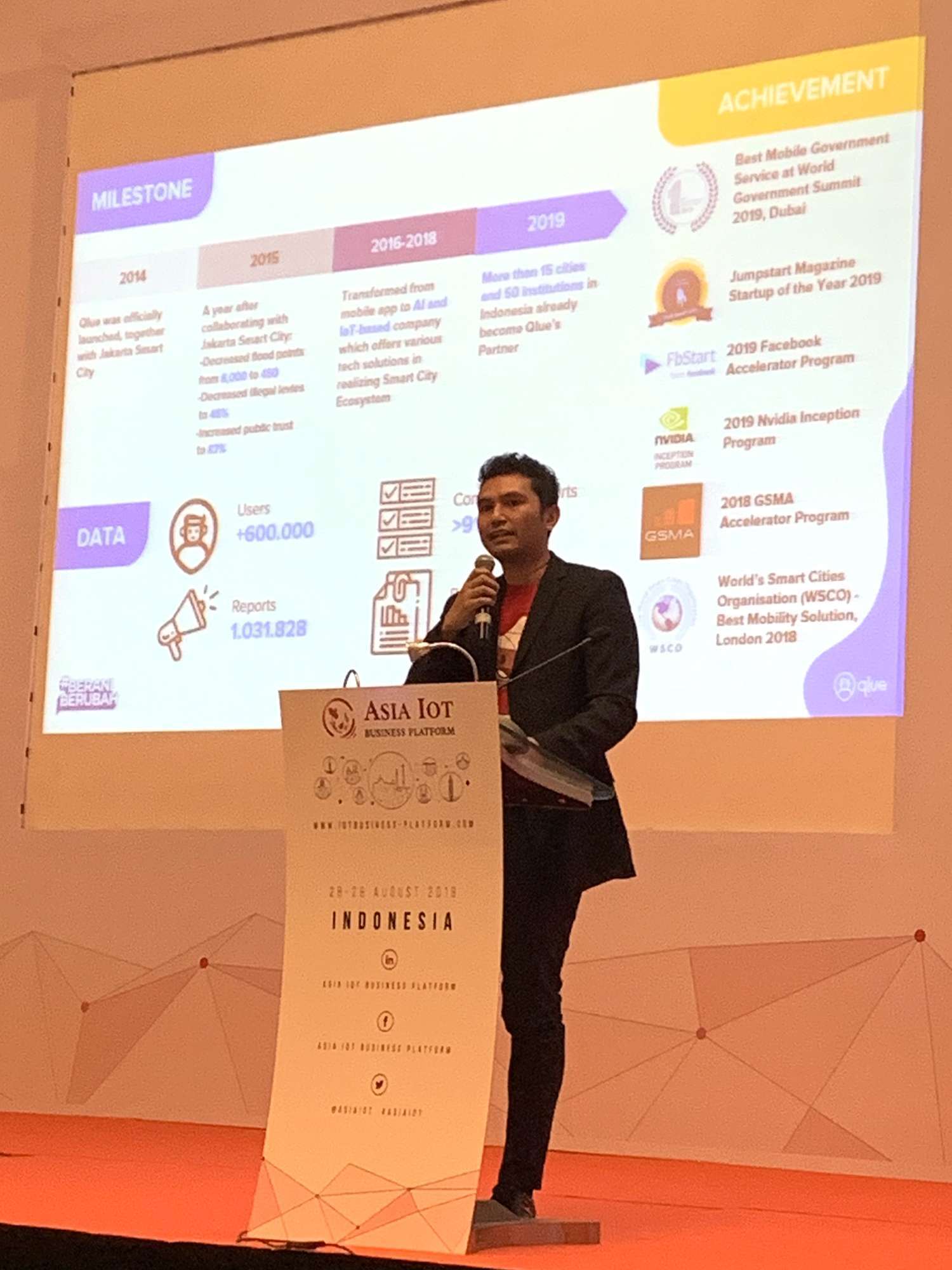 Qlue juga menjadi salah satu pembicara di pertemuan bisnis IoT se-Asean tahun ini, yaitu The 32nd Asia IoT Business Platform, yang digelar di Jakarta, pada 29 Agustus 2019. Asia IoT Business Platform adalah platform bisnis yang menjadi wadah untuk mempertemukan para pemangku kepentingan di industri Internet of Things (IoT), seperti pemerintah, pelaku bisnis, pembuat solusi, dan penyedia infrastruktur, yang berada di kawasan-kawasan Asean.