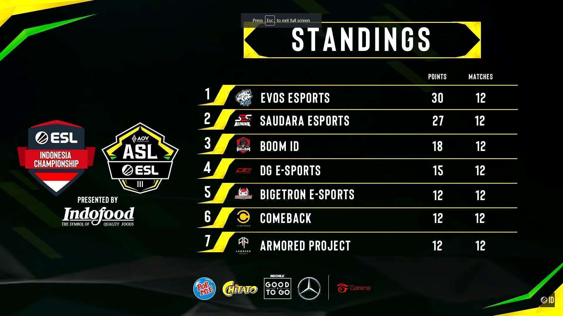 Dengan seluruh hasil pertandingan yang terjadi selama 6 pekan, berikut ini adalah 4 tim yang akan berlaga di Grand Final ASL Indonesia S3 by ESL: