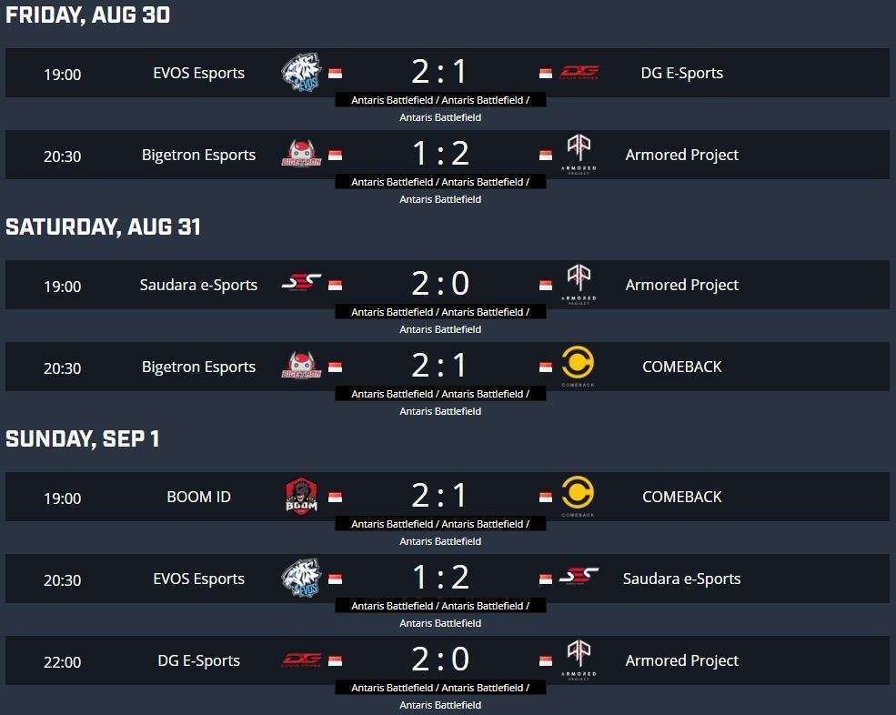 Sayangnya, COMEBACK, yang harus berebut kursi dengan DG E-sports, tak berhasil memanfaatkan semua kesempatan yang ada. Mereka harus bertekuk lutut di 2 pertandingan mereka di pekan keenam. Melawan Bigetron, COMEBACK sebenarnya punya peluang untuk menang. Namun Irdham “Damskii” Hilmansyah dan kawan-kawan dari COMEBACK sepertinya memang sungguh tidak beruntung. Kesialan yang sama juga terjadi di hari ketiga saat mereka melawan BOOM ID. Saat melawan BOOM ID, COMEBACK sebenarnya bahkan bisa mencuri poin di Game pertama. Sayangnya, BOOM ID berhasil meng-comeback tim COMEBACK dan menutup pertandingan dengan skor akhir 2-1.