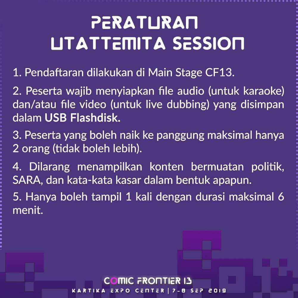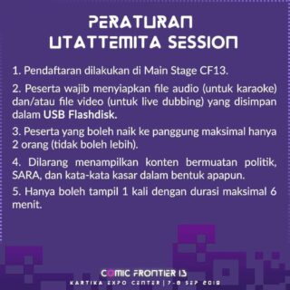Ada beragam cara yang bisa dilakukan oleh para kreator untuk menunjukkan karyanya di Comic Frontier 13. Dalam acara ini pengunjung juga bisa menunjukkan bakatnya dalam Utattemita Session yang diadakan di panggung utama. Utattemita Session adalah sesi khusus selama 2 jam (dari jam 10.00-12.00) di mana seluruh pengunjung bisa berkaraoke dan bahkan melakukan live dubbing. Untuk mengikuti Utattemita Session ini para pengunjung diharuskan melakukan registrasi karena slot yang dibuka terbatas.