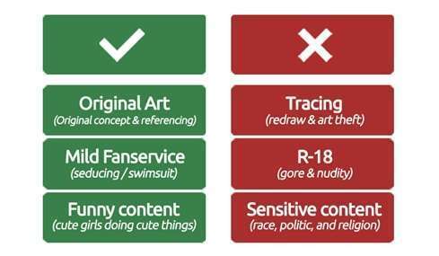 Yang pasti, dalam setiap lomba ilustrasi pastinya dilarang banget untuk menjiplak. Selain itu, ada batasan rating gambar di mana kontennya tidak boleh sampai menunjukkan bagian sensitif. Dan yang terakhir, dalam ilustrasi ini tidak boleh mengandung isu SARA ya!