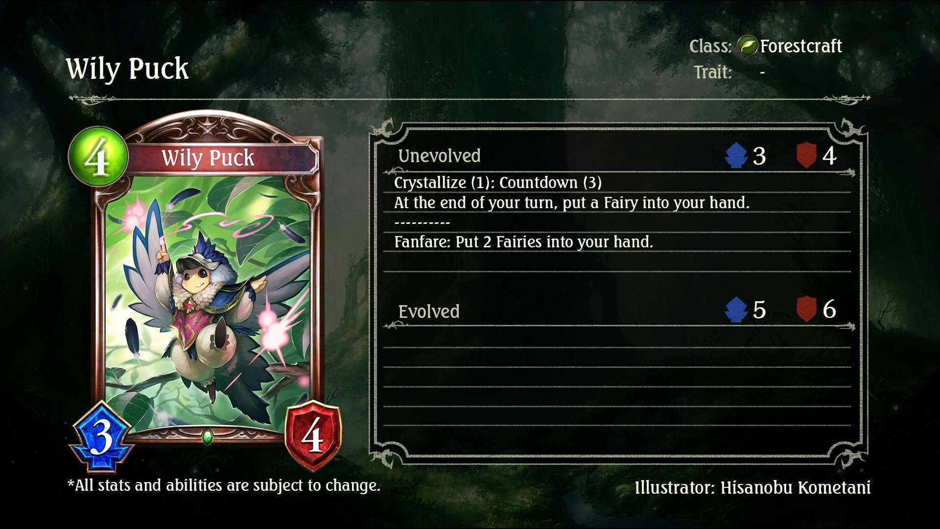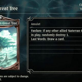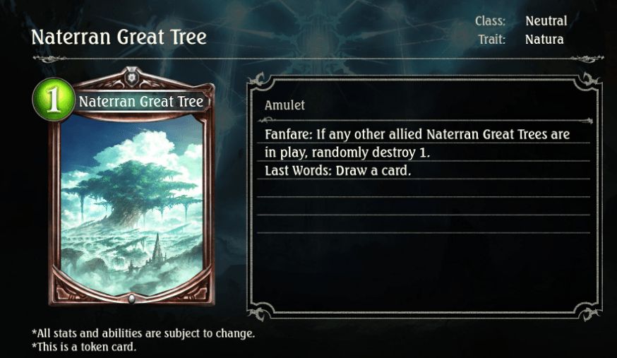 “Fanfare: Jika punya 2 fairies, berikan 4 damage ke salah satu follower musuh. Selain itu, jika punya Naterran Great Tree di permainan, bisa mendapatkan abiliti untuk evolve dengan 0 poin.