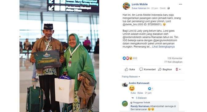Bekerja sama dengan pergiumroh.com, IGG dan Lords Mobile telah memberangkatkan Kedua orangtua @dwink_bro dari Wajo, Sulawesi Selatan menuju ke tanah suci via Jakarta pada 8 Oktober 2019 silam. Berbekal sepaket merchandise fungsional dari tim IGG, di antaranya termos dan payung, kedua bapak ibu insya Allah akan kembali lagi ke Tanah Air pada tanggal 16 Oktober 2019. Semoga ibadah keduanya mabrur dan IGG melalui Lords Mobile dapat mengadakan event serupa ke depannya.