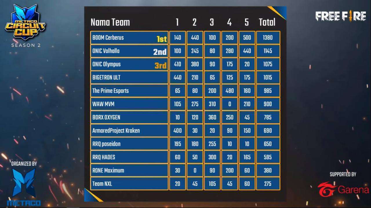 Namun yang terjadi justru sebaliknya. ONIC Olmypus jadi tim ketiga yang gugur di game pamungkas. Ini membuat peringkat pertama dan gelar juara bisa dengan mudah direbut oleh siapa saja. Pada akhirnya BOOM Cerberus yang berhasil mendapatkan Booyah dan mencatatkan 10 kill di game kelima. Ini otomatis memberikan mereka gelar juara Metaco Circuit Cup Season 2, disusul oleh ONIC Valhalla dan ONIC Olympus.
