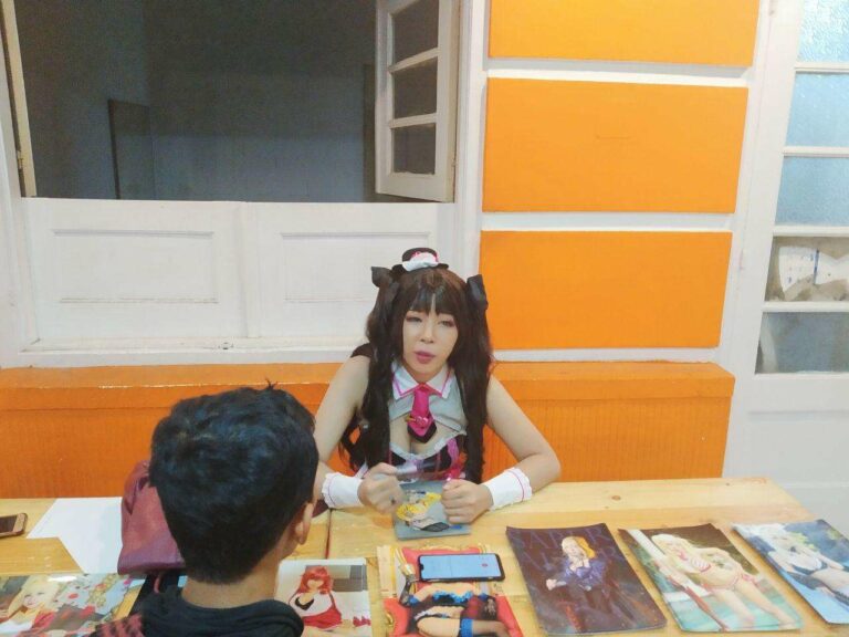 Aku pertama cosplay itu tahun 2005, eh bukan 2005. Berarti pas masih SD dong? Hahaha …yang bener itu tahun 2015. Waktu itu masih cosplay random gitu. Kayak wig Miku pakai baju maid. Terus naik jadi Honoka. Itu pertama kali kayak bener-bener jadi cosplay gitu.