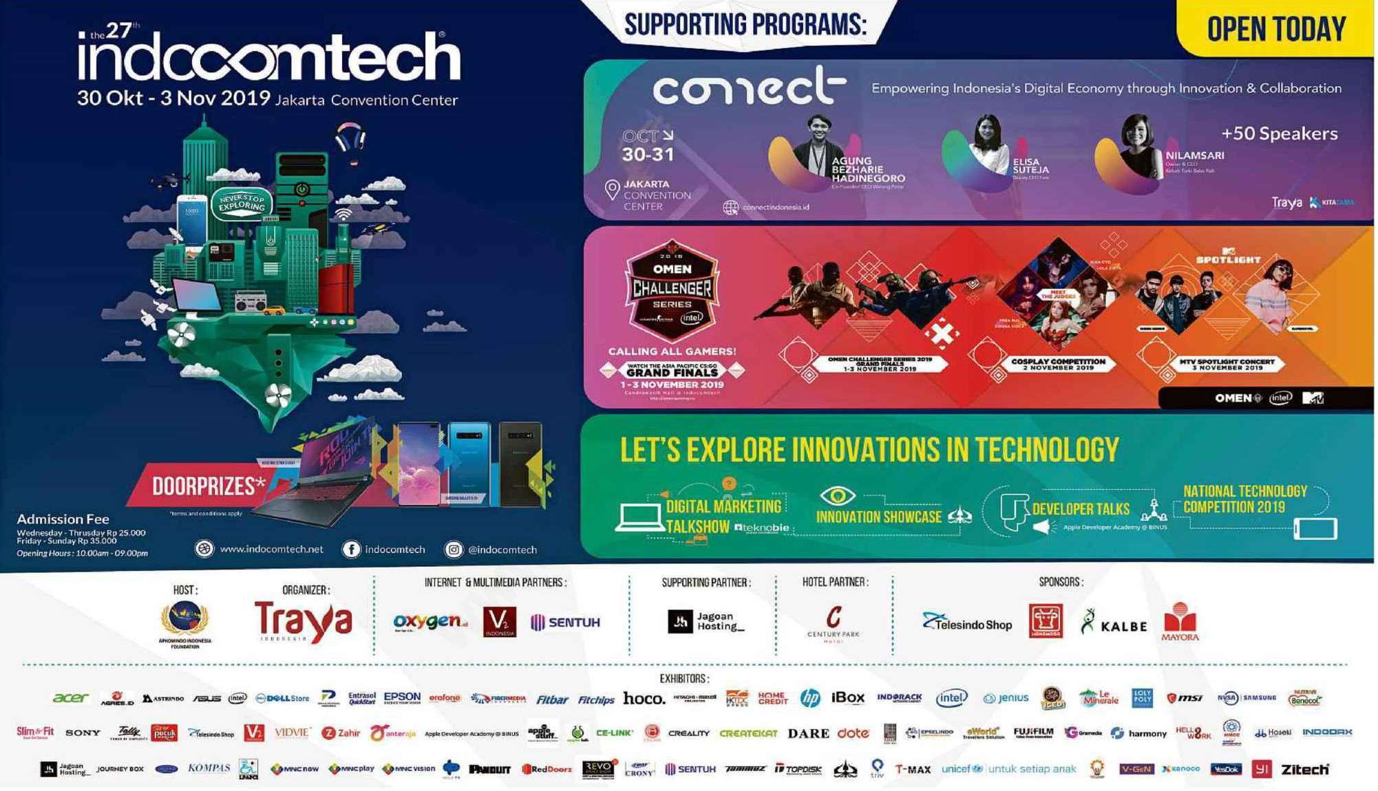 Pada perhelatan Indocomtech 2019 ini, mereka menyuguhkan beragam tren teknologi terkini. Ada 250 perusahaan teknologi dari lokal maupun internasional seperti HP, acer, ASUS, MSI, Dell, intel, EPSON, V-Gen, dan Apple (iBOX) sebagai platform jual beli aset digital terbesar di Indonesia. Selama event ini berlangsung, para ekshibitor memamerkan produk anyarnya untuk memenuhi kebutuhan masyarakat Indonesia dalam beberapa hal seperti accessories, audio, camera, gaming equipment, laptop & PC, TV, Telco, smartphone, smarthome dan wearable device.