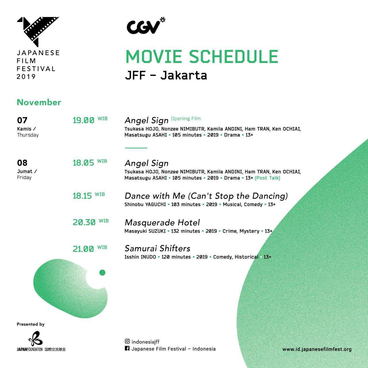 Tahun 2019, Japanese Film Festival (JFF) di Indonesia menginjak tahun yang ke-4. JFF Indonesia membawa 12 film terbaru dari beragam genre untuk diperkenalkan kepada masyarakat di Indonesia khususnya di lima kota yaitu Jakarta, Yogyakarta, Makassar, Surabaya dan Bandung. JFF akan diselenggarakan di Surabaya untuk pertama kalinya dan tahun ini pun Bandung menjadi penutup rangkaian JFF di Indonesia seperti tahun sebelumnya. Tahun ini JFF mendatangkan Zara dari grup idola JKT48 yang tengah naik daun akhir-akhir ini sebagai duta Japanese Film Festival 2019. Selain itu aktris Yoshida Mikako akan hadir pada JFF 2019. Ia berperan pada salah satu film karya Kamila Andini yang menjadi bagian dari film omnibus bisu berjudul “Angel Sign” dan akan diputar sebagai film pembuka JFF 2019 di Jakarta. Ia beradu akting dengan aktor Indonesia, Teuku Rifnu Wikana, sebagai perempuan Indonesia. Beberapa film lainnya yang pernah ia bintangi antara lain “The Edge of Sin” (2015), dan “Tokusatsu Gagaga” (2019). Yoshida Mikako akan hadir pada setiap pemutaran film Angel Sign di JFF Jakarta.