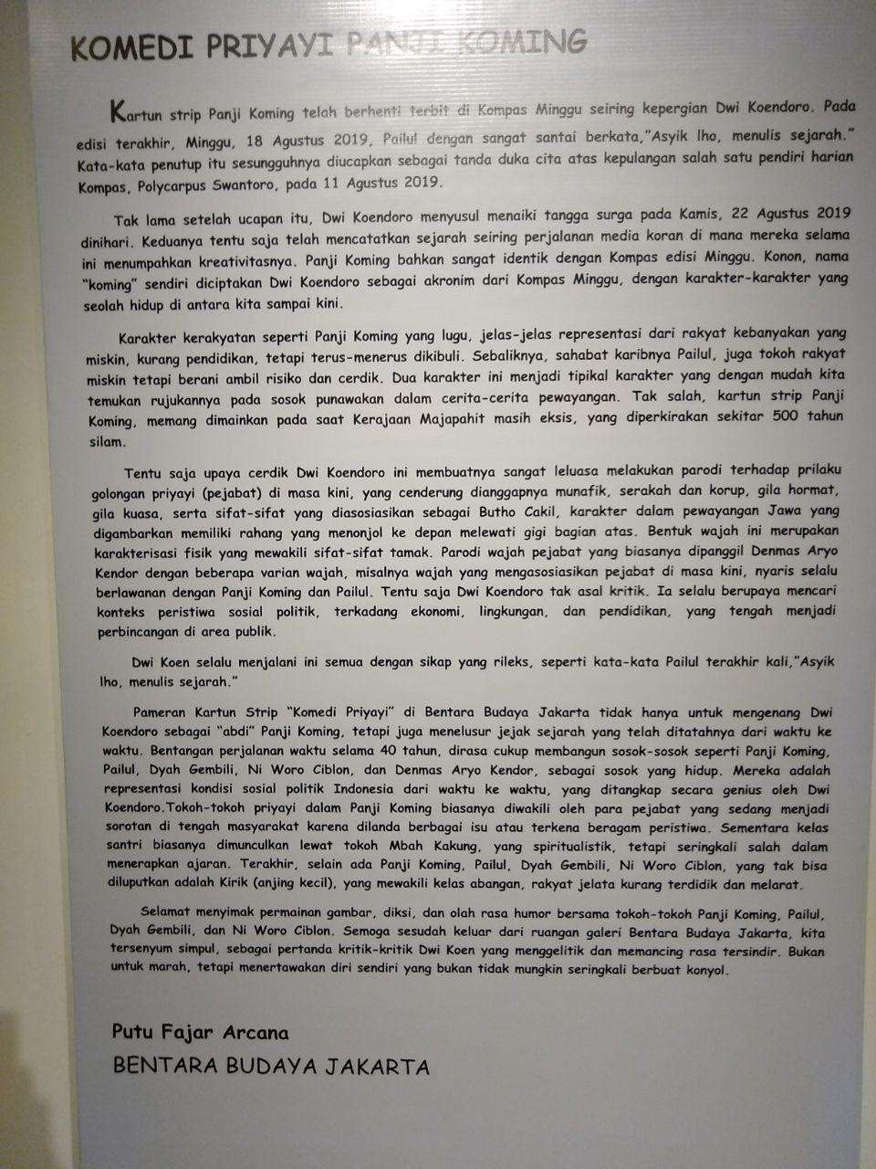 Panji Koming, sosok karakter komik satir ini sudah tidak asing lagi bagi para pembaca surat kabar Kompas Minggu. Pada tanggal 20 hingga 24 November 2019, Bentara Budaya Jakarta menggelar pameran bertajuk Pameran Kartun Dwi Koen “Komedi Priyayi Panji Koming”. Dalam pameran yang juga diselenggarakan hampir bersamaan dengan peringatan 1000 hari wafatnya sang komikus, Dwi Koendoro ini, pengunjung dapat melihat sejumlah komik-komik Panji Koming dari masa ke masa, yang membentang dari tahun 1979 hingga 2019, lengkap dengan substansinya yang mengangkat problema-problema terkini pada zamanya.