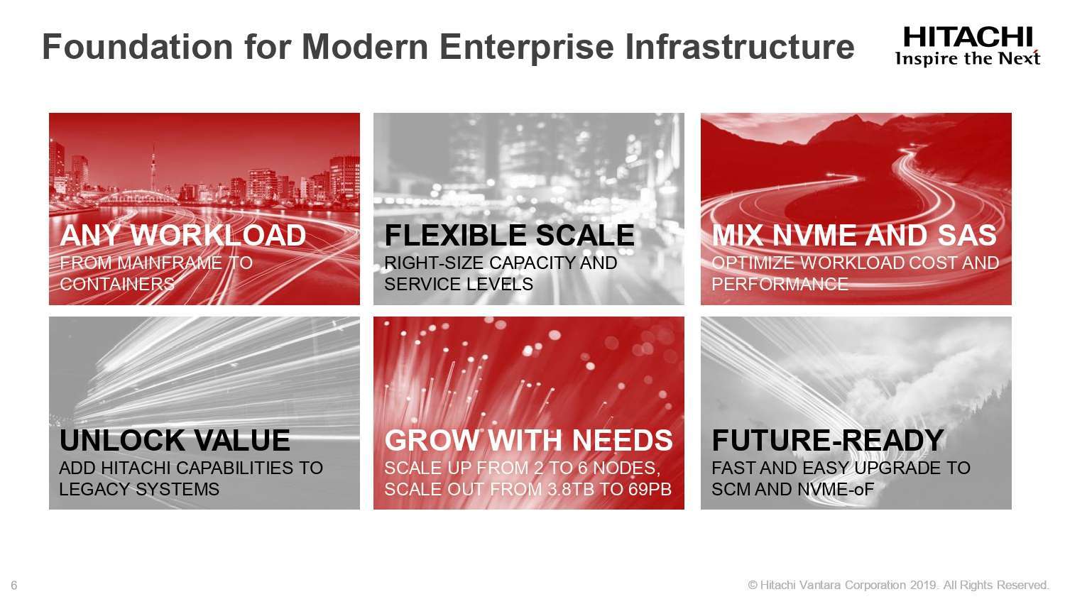 VSP 5000 series dirancang sedemikian rupa sehingga pelanggan dapat memulai dari kapasitas kecil lalu tumbuh, sesuai kebutuhan, hingga ke skala masif dan dalam service level yang terprediksi. VSP 5000 series juga didesain untuk mengakselerasi dan mengkonsolidasi banyak beban kerja dalam berbagai jenis, termasuk di antaranya sistem transaksi tradisional, aplikasi modern dalam container, analytics, bahkan mainframe, dan lebih banyak aplikasi lagi dari sebelumnya, di mana keunggulan ini akan menghemat biaya dan mengurangi data center footprint.
