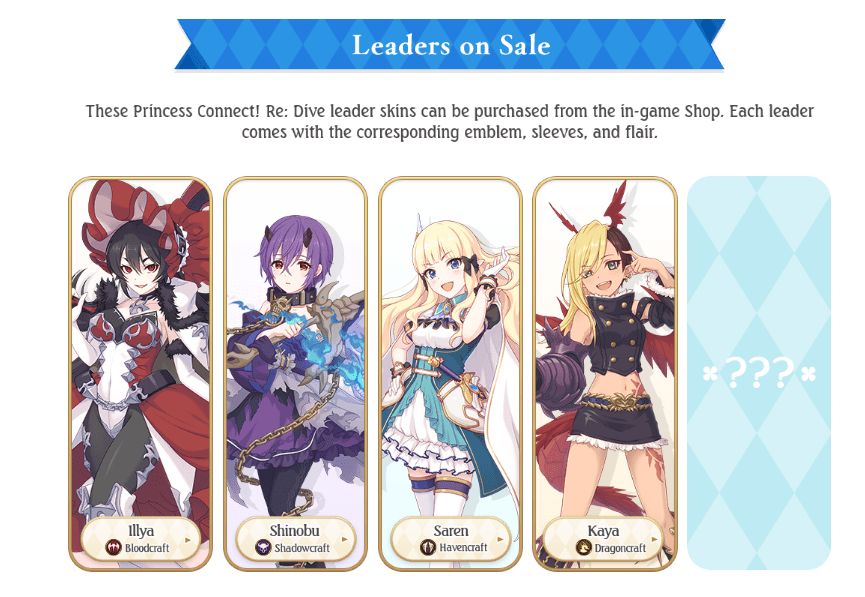 Selain dari mekanik baru dari Princess Connect Re: Dive, Shadowverse juga menghadirkan beberapa karakter dari gim tersebut yang menjadi Alternate Leader yang bisa dibeli oleh pemain di Shop.