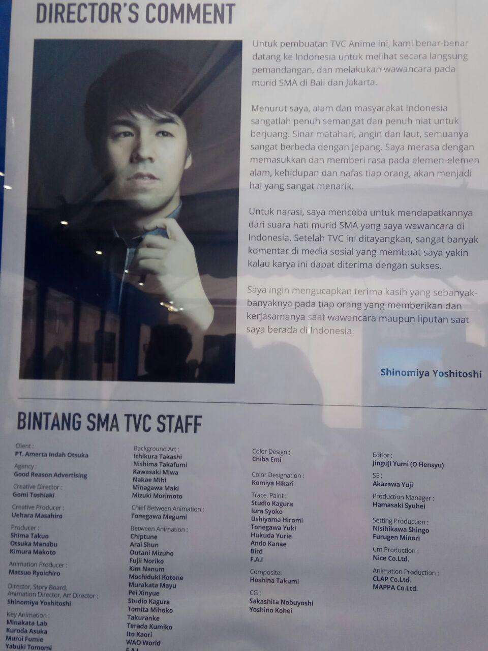 Bukan hanya atraksi-atraksi di atas. Di Pocari Festival para pengunjung juga bisa melihat proses di balik layar dari pembuatan video iklan TVC POCARI SWEAT – Bintang SMA yang viral itu, serta berkesempatan untuk bertemu langsung dengan sutradara dari video iklan tersebut, yang tak lain dan tak bukan adalah Yoshitoshi Shinomiya. Yoshitoshi Shinomiya sendiri adalah seorang artis asal Jepang yang cukup banyak terlibat dalam sejumlah produksi anime, terutama dalam hal desain ilustrasi maupun background. Sejumlah anime yang pernah ia tangani di antaranya beberapa anime karya sutradara kenamaan Makoto Shinkai seperti Children Who Chase Lost Voices, The Garden of Words, hingga your name. Ia juga membuat sejumlah iklan bergaya anime sebagaimana iklan Pocari Sweat – Bintang SMA yang sempat viral itu, termasuk juga menggambar visual dari film layar lebar Pokemon. Beberapa anime yang juga turut ia kerjakan di antaranya adalah In This Corner of the World, Shoujo Shuumatsu Ryokou, Napping Princess, dan sejumlah judul lainnya.