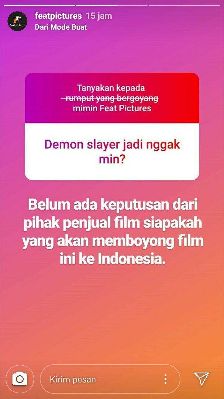Feat Pictures sendiri memang ingin mengetahui lebih lanjut animo publik di Indonesia mengenai film layar lebar dari anime Kimetsu no Yaiba yang rencananya akan dirilis di Jepang pada tahun 2020 ini. Karenanya mereka sempat membuka jajak pendapat kepada publik, dan bermaksud untuk membeli filmnya untuk kemudian dirilis di Indonesia. Namun mengenai apakah film yang bersangkutan akhirnya bisa dijual ke Indonesia, dan distributor manakah nantinya yang akan membeli filmnya untuk dirilis di Indonesia, semuanya bergantung kepada pihak yang menjual filmnya. Karenanya saat ini mereka masih belum bisa janji untuk merilis film layar lebar ini ke Indonesia. Apalagi di Jepang sendiri juga masih belum ada kejelasan mengenai kapan kiranya film yang bersangkutan akan dirilis secara resmi.
