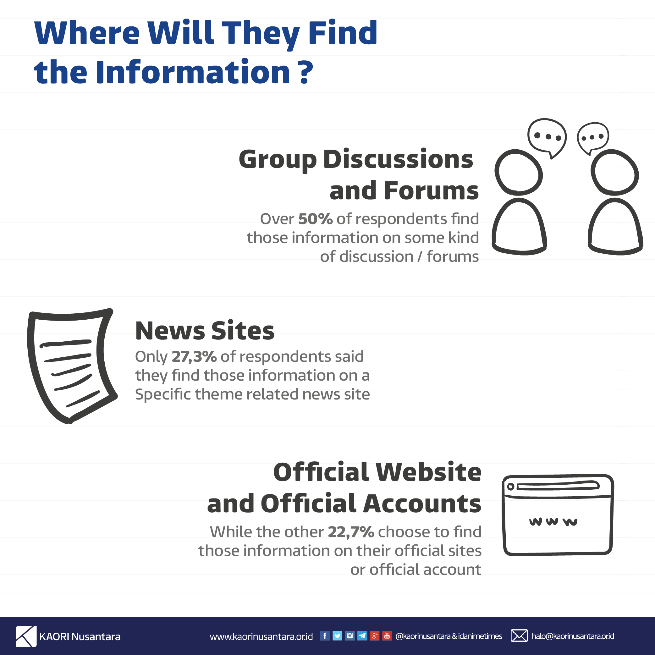 Menariknya melalui jajak pendapat yang dilakukan Litbang KAORI, informasi yang beredar di kalangan fans sebenarnya masih berpusat di forum serta grup diskusi internet. Sekitar 50 persen dari mereka mendapatkan informasi melalui forum dan/atau grup. Setelah membaca informasi tersebut pun, hanya sekitar 4,5 persen dari mereka yang menjadi partisipan dari media sumber informasinya. Di sini terlihat sebenarnya tantangan dari media online di Indonesia adalah bagaimana agar konten mereka mampu dibaca dan disebar oleh para penggemar sebanyak mungkin.