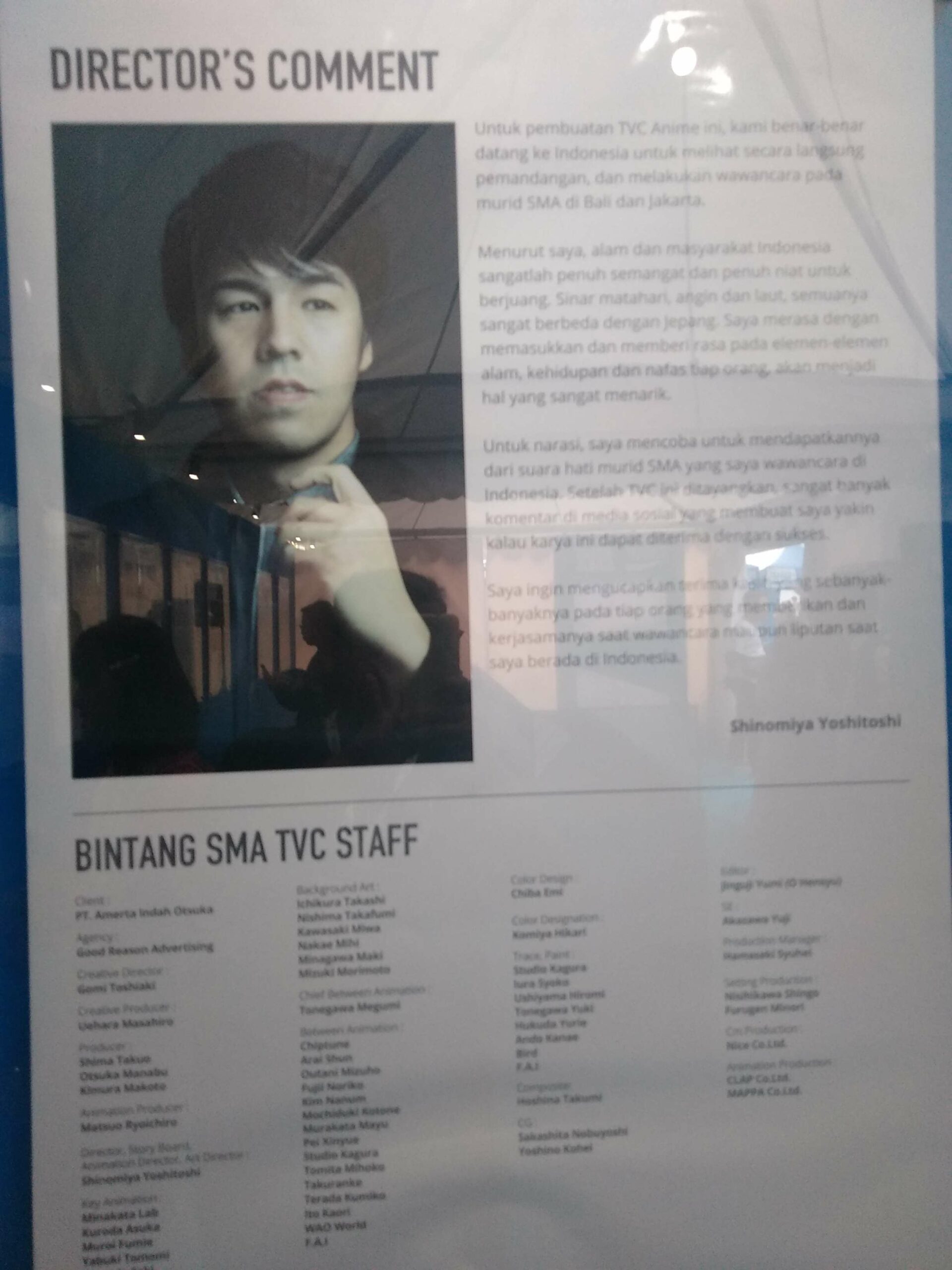 Dalam membuat iklan ini saya menginap 5 hari di Indonesia untuk mencari lokasi. Dan saya sangat terkesan dengan pemandangan di Jakarta, dengan gedung yang besar sekali namun masih banyak pohon – pohon dan pemandangan hijau di sekitarnya. Hal itu tidak terdapat di Jepang. Dan saya juga sempat ke Bali, dan orangnya sangat ramah sekali hingga saya diizinkan untuk dapat berkunjung ke rumah penduduk. Dan itu sangat menarik.
