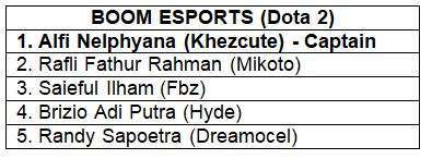 BOOM Esports, sebelumnya dikenal sebagai BOOM ID, adalah organisasi olahraga yang didirikan pada November 2016. Dengan “Beast On Our Mind” BOOM Esports memiliki misi untuk menjadi organisasi esports nomor 1 di dunia, dan untuk mewakili Indonesia mendominasi di panggung dunia game profesional. BOOM Esports menjadi salah satu organisasi esports yang secara konstan fokus mengembangkan pemainnya, bentuk nyata hal ini adalah roster Dota 2 BOOM Esports yang stabil, dan sangat jarang berganti pemain. Saat ini Boom Esports beranggotakan 5 pemain, yaitu Alfi Nelphyana (Khezcute), Rafli Fathur Rahman (Mikoto), Saieful Ilham (Fbz), Brizio Adi Putra (Hyde), Randy Sapoetra (Dreamocel). Kemenangan BOOM Esports dI Indonesia Final Predator League 2020 adalah yang ketiga kali berturut-turut untuk Dota 2. Kali ini, BOOM Esports akan kembali membawa nama Indonesia di ajang Grand Final Asia Pacific Predator League 2020.