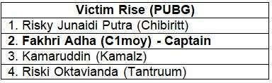 Sedangkan Victim Rise yang dipimpin oleh C1moy bersama Tantruum, Kamalz, dan Chibiritt, menjadi juara PUBG setelah perjuangan keras mereka melawan Victim Reality di babak final yang ditentukan lewat 6 match. Victim Rise mampu mengungguli poin Victim Reality, dengan 91 poin setelah meraih 3 placement dan 49 kills melawan Victim Reality yang belum sempat mendapatkan placement dan 31 kills.