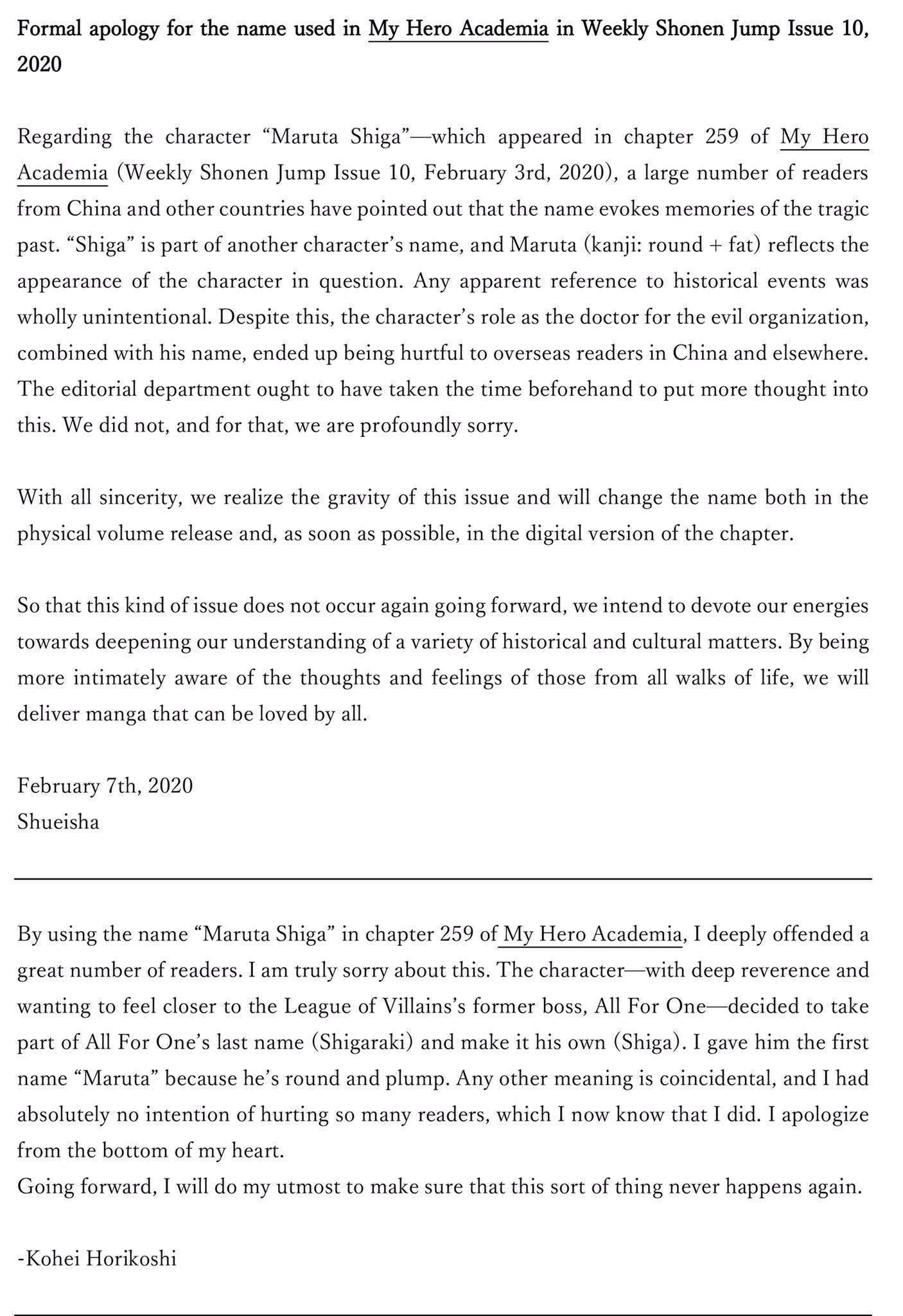 Atas kasus yang begitu sensitif dalam hubungan antara Jepang, Tiongkok, dan Korea ini, baik Kohei Horikoshi maupun penerbit Sueisha sendiri akhirnya melayangkan permohonan maaf dan berjanji bahwa kasus seperti ini tidak akan pernah terjadi lagi. Pihak Shueisha juga berjanji akan mengganti nama Maruta Shiga di komik versi tankoubon maupun versi terbitan digitalnya. Saking sensitifnya kasus ini, My Hero Academia sendiri saat ini tengah ditarik dari berbagai platform digital di Tiongkok. Sejumlah pengguna Twitter, terutama yang berasal dari Korea Selatan bahkan juga mengungkap kekesalan mereka karena dalam surat permintaan maaf resmi versi bahasa Inggris dan bahasa selain Korea hanya menyebutkan protes datang dari “sejumlah pembaca dari Tiongkok dan negara lain”, berbeda dengan surat permintaan maaf berbahasa Korea yang menyebutkan protes datang dari “sejumlah pembaca dari Tiongkok, Korea, dan negara lain.”