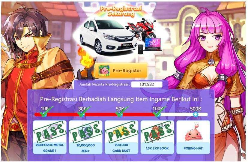 Gravity Game Link mengumumkan bahwa pre-registrasi Ragnarok Frontier telah mencapai 100.000. Game bergenre MMORPG cross platform ini mendapat banyak sekali antusiasme dari RO Mania di seluruh Indonesia. Jumlah player yang melakukan pre-register telah meningkat secara signifikan dalam hitungan hari. Dengan tercapainya 100.000 pre-register, pemain yang mengikuti pre-registrasi akan mendapat beragam hadiah dalam game yang akan diberikan saat game dirilis, yaitu: