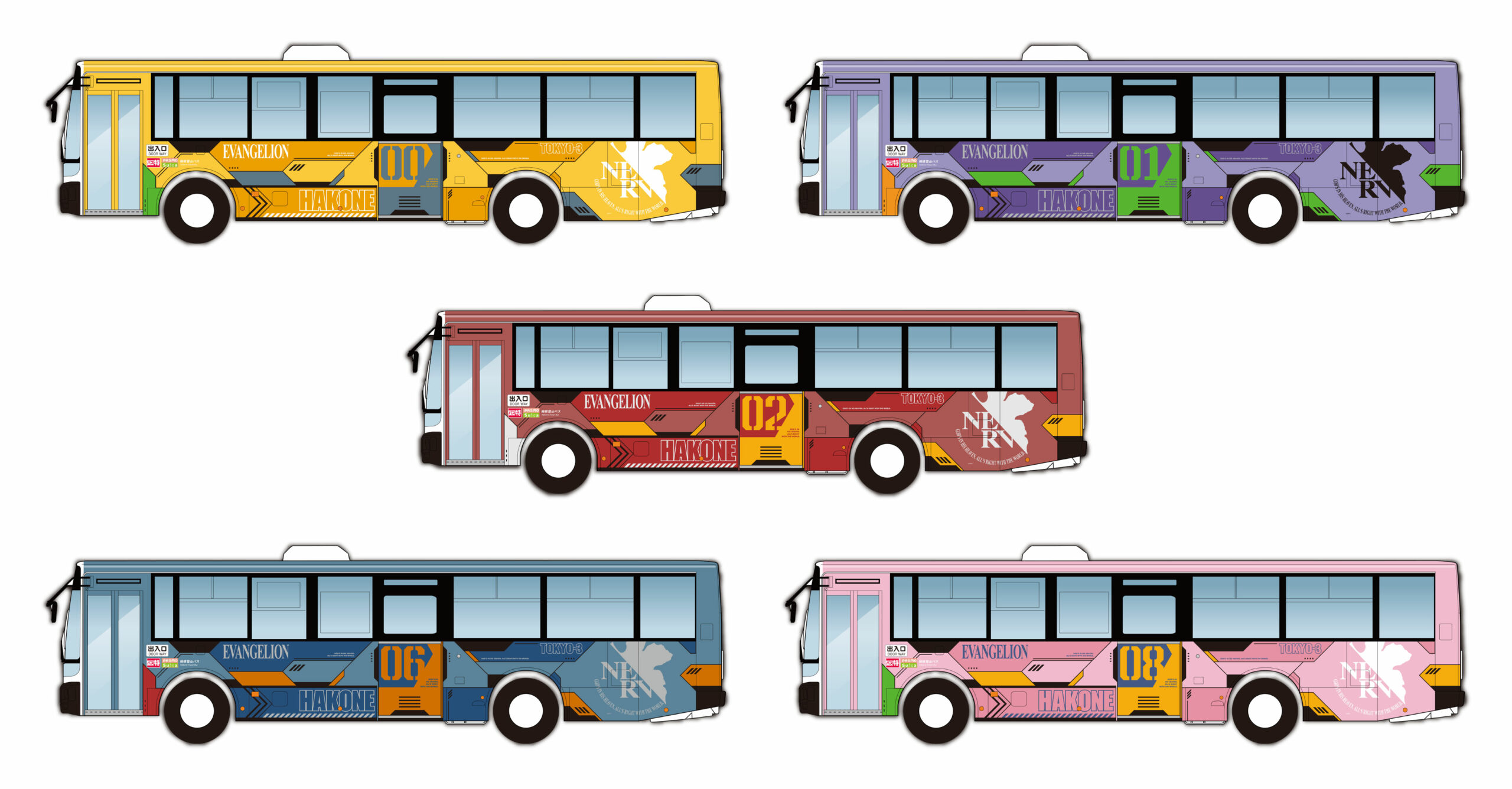 Pada rute Hakone Tozan Bus yang dimodifikasi dengan gambar Evangelion, terdapat pula siaran dengan suara karakter populer Evangelion seperti Misato Katsuragi di dalam bus, pada bus rute Hakonemachi Line termasuk bus Evangelion, yang beroperasi pada rute (Stasiun Odawara-Pelabuhan Hakonemachiko). Bus Evangelion oleh Bus Hakone Tozan terinspirasi dari Evangelion “EVA-00”, “EVA-01”, “EVA-02”, “Mark6″ dan “EVA-08”. Bus ini hanya akan dibatasi hingga 5 bus. Simak lebih lanjut informasi waktu realtime bus Evangelion di web Bus Hakone Tozan.
