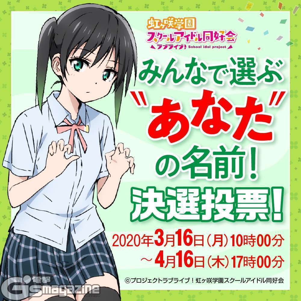 Love Live!, proyek mix-media idol ini sebagaimana telah diberitakan sebelumnya, akan hadir kembali dalam proyek anime terbarunya. Dengan judul Love Live! Nijigasaki Gakuen School Idol Doukoukai/Club, proyek terbaru anime ini diangkat dari gim ponsel Love Live! School Idol Festival ALL STARS dengan menghadirkan unit idol baru bernama Nijigasaki High School Idol Club. Selain itu akan dihadirkan juga karakter baru yang merupakan personifikasi dari pemain gim ponsel School Idol Festival ALL STARS. Karakter yang juga disebut dengan sebutan “anata” (yang berarti “kamu”, merujuk pada pemain School Idol Festival ALL STARS) ini masih belum memiliki nama yang resmi. Karenanya pihak Dengeki saat ini tengah membuat polling untuk menentukan nama resmi dari sang karakter di animenya. Polling yang dibuka sejak tanggal 16 Maret 2020 ini akan diselenggarakan hingga 16 April 2020 mendatang. Inilah nama-nama yang bisa dipilih dalam polling tersebut: