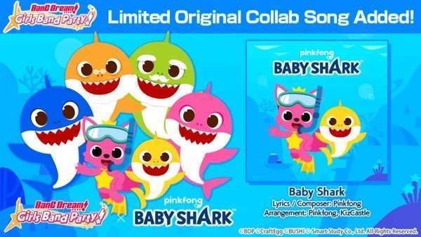 BanG Dream!, proyek media mix mengenai grup band anak perempuan ternama ini akan menjalin kolaborasi dengan Pinkfong Baby Shark. Kolaborasi ini berupa lagu Baby Shark yang akan dimuncukan di gim ponsel rhythm BanG Dream! selama tanggal 27 Maret hingga 17 April 2020.