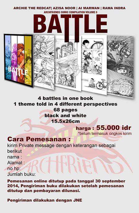 Komikus Archie The Redcat membuka pemesanan online untuk komik terbarunya BATTLE: Archfriend comic compilation vol. 0. Komik ini berisikan kompilasi karya 4 komikus di antaranya Archie The Redcat, Azisa Noor, Ai Marwan, dan Rama Indra. Anda bisa melihat beberapa teaser dari komik kompilasi ini pada gambar-gambar di bawah ini:
