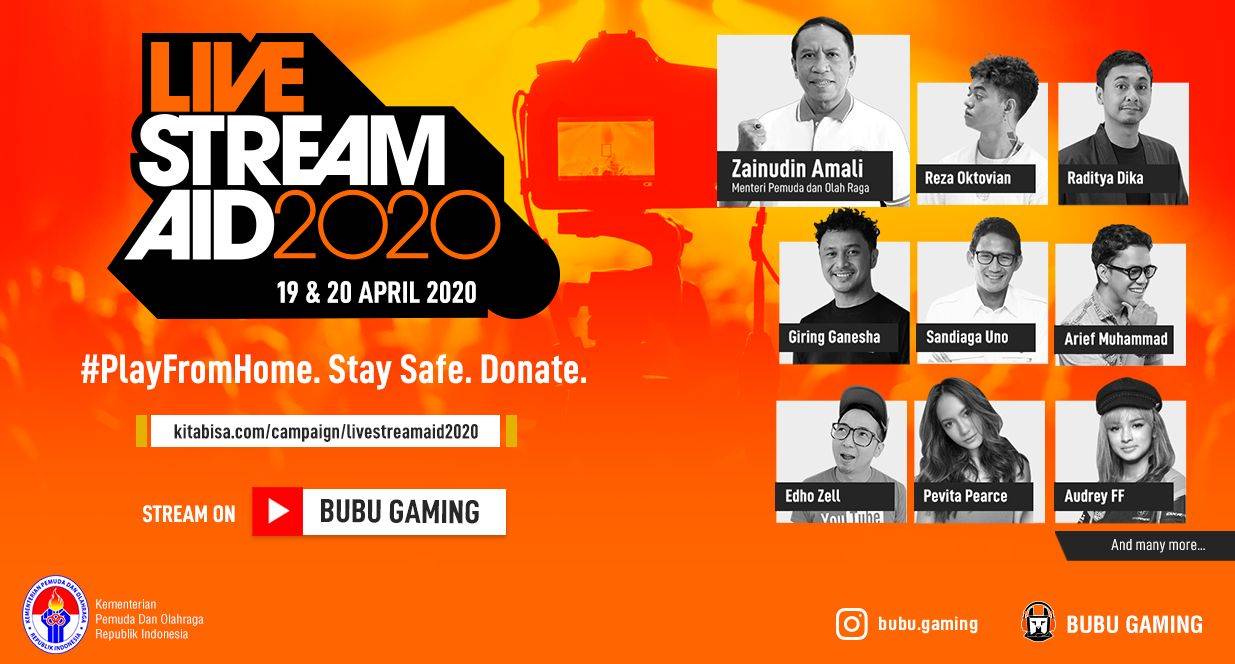 Aksi penggalangan dana yang diberi nama LiveStream Aid 2020 ini, akan berlangsung selama dua hari dari tanggal 19 – 20 April mendatang. Sebagai bentuk dukungan pemerintah untuk mereka yang berjuang di garda terdepan, acara ini akan dibuka oleh Menteri Pemuda dan Olahraga, Zainudin Amali. BUBU Gaming akan menggandeng sejumlah esports Influencers dan content creators ternama tanah air seperti Giring Ganesha, Reza Arap, Arief Muhammad, Edho Zell, InYourDream, Supernayr, Donna Visca, Audrey FF, dan masih banyak lagi. Bahkan Sandiaga Uno, selaku Dewan Pembina PB Esports Indonesia juga akan memberikan waktunya dalam membantu mensukseskan LiveStream Aid 2020.
