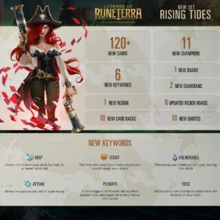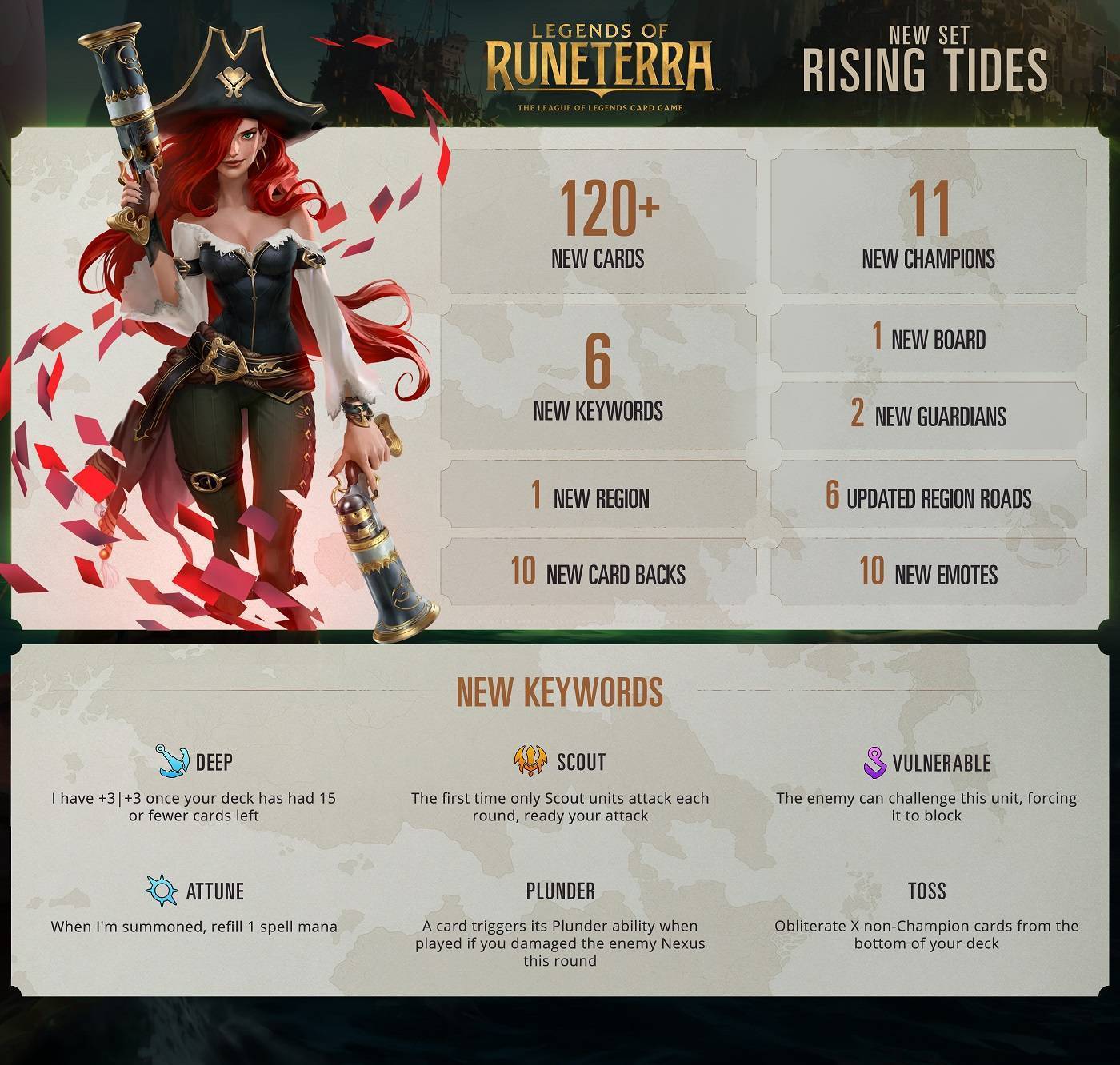 Rising Tides memetakan wilayah baru dengan penambahan Bilgewater, sebuah wilayah kekuasaan sekelompok bajak laut yang tidak pernah melewatkan kesempatan untuk melakukan penjarahan dan juga monster di kedalaman yang suka melahap kapal tanpa peringatan. Di pelabuhan Bilgewater yang berbahaya, warga setempat hanya punya satu prinsip, yaitu ambil apa pun yang Anda bisa. Rising Tides hadir dengan lebih dari 120 kartu dan 11 jawara (champions) baru dari semesta League of Legends, termasuk Miss Fortune, Fizz, dan Gangplank. Set ini juga memperkenalkan enam mekanisme kartu baru, memberikan opsi gameplay yang lebih mendalam dan menarik untuk para pemain.