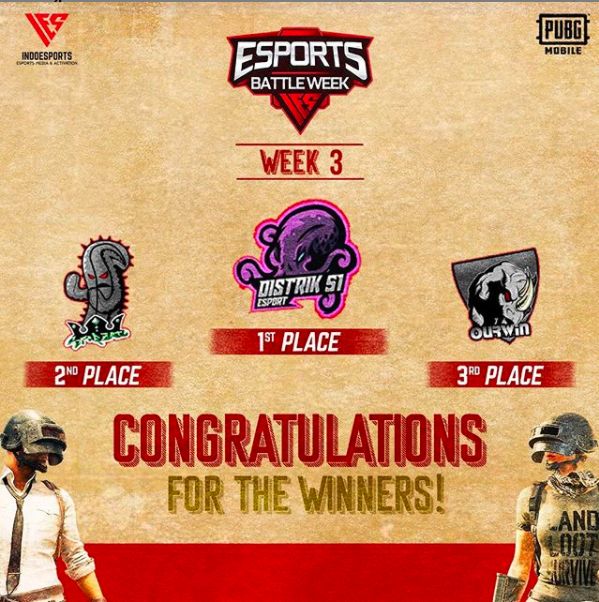 Sejauh ini, tim-tim yang ikut serta adalah tim-tim komunitas yang tangguh serta para rookie gamers yang memiliki skill mumpuni. Turnamen PUBG Mobile di Esports Battle Week #3 yang baru saja usai diselenggarakan juga diikuti oleh tim-tim tangguh. Adapun juara-juara baru yang keluar di turnamen PUBG Mobile minggu ketiga lalu adalah: