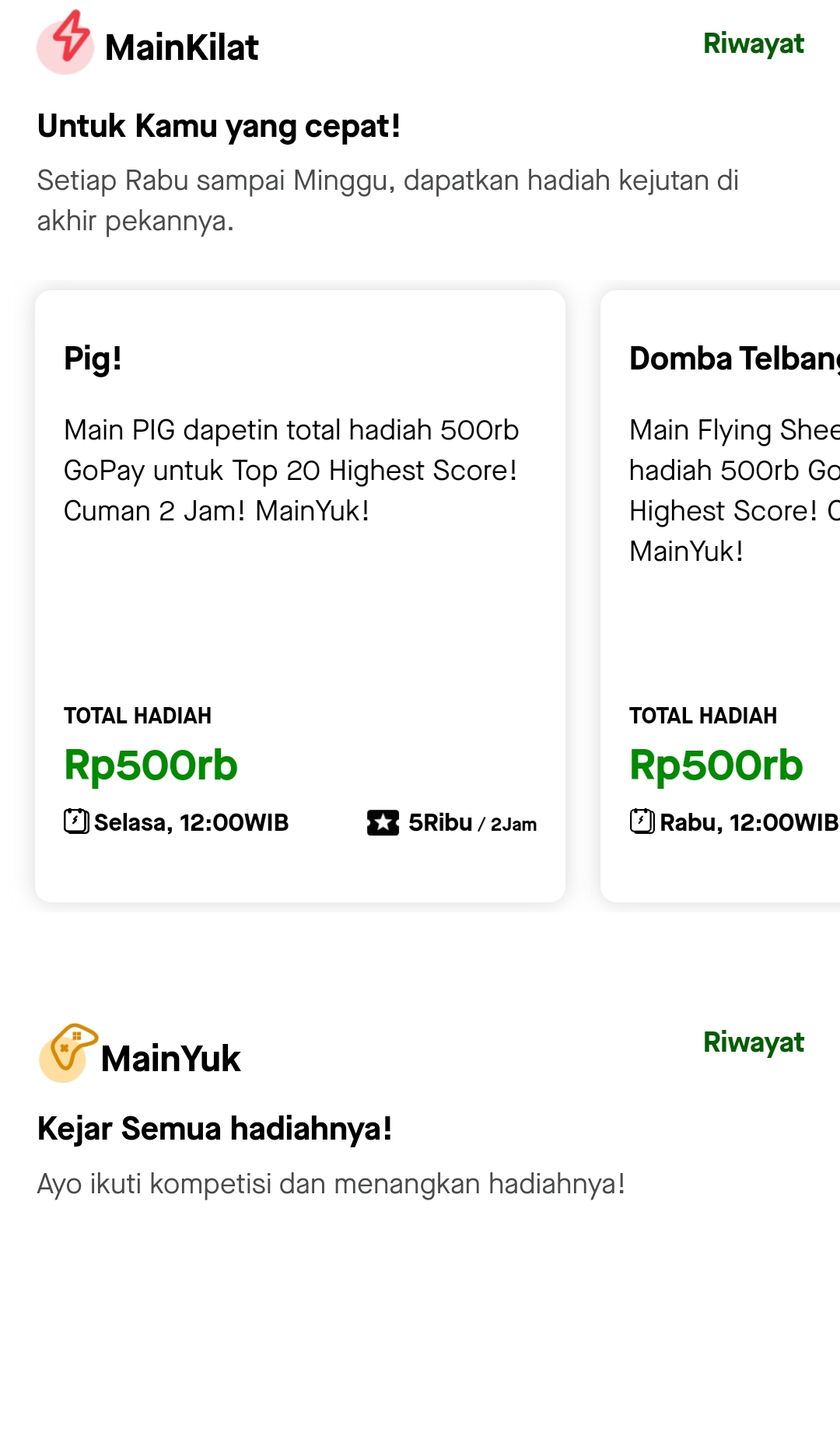 Maingame.com dalam platform GoGames memberikan kesempatan kepada para pengguna untuk mendapatkan saldo GoPay hanya dengan bermain dan berkompetisi. Selain featured competitions dan kompetisi MainYuk, terdapat juga kompetisi MainKilat, yang mengajak para pengguna berkompetisi dalam permainan pilihan selama 120 menit. Semakin tinggi nilai yang pengguna dapatkan, semakin tinggi pula kesempatan mendapatkan hadiah saldo GoPay.