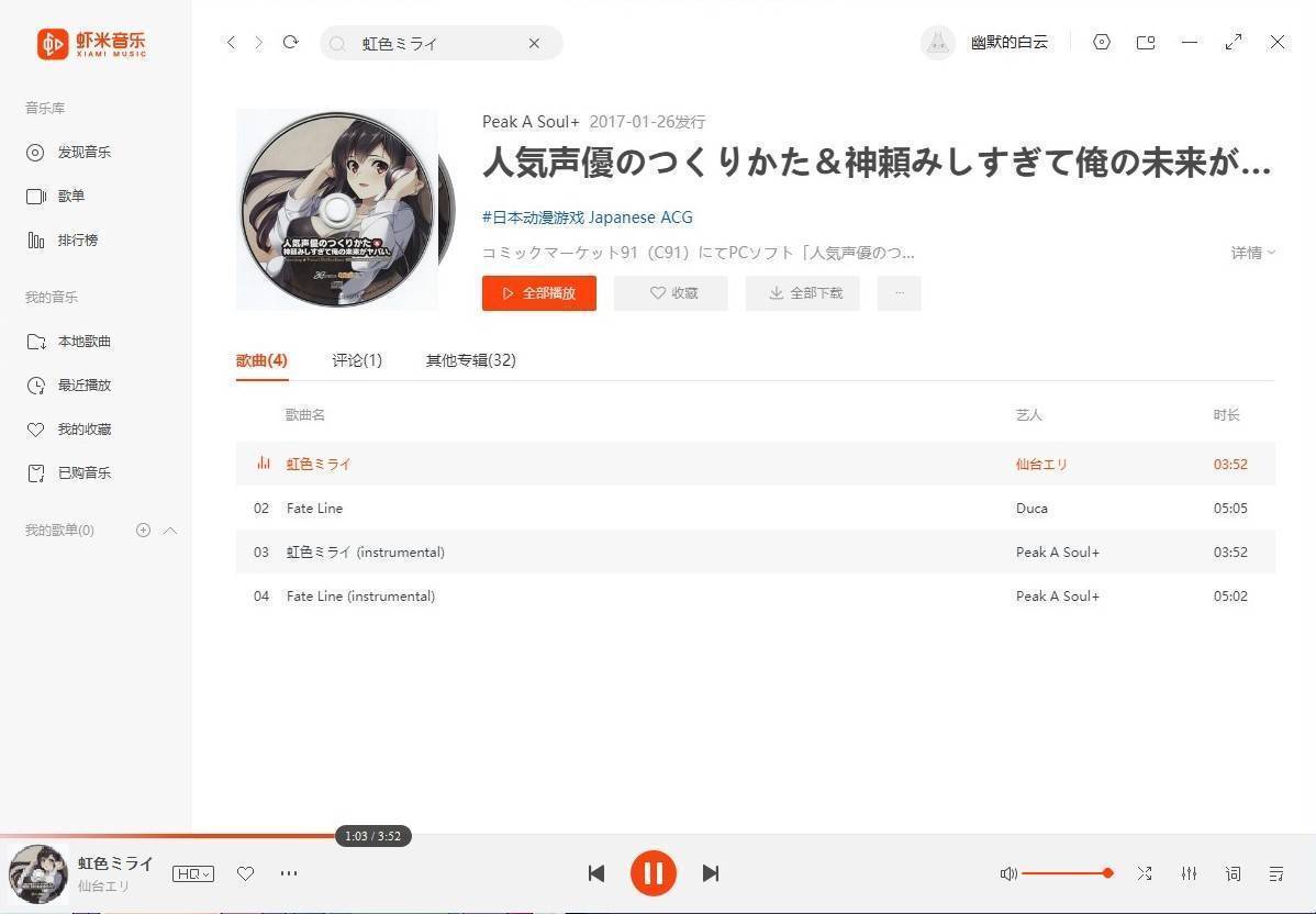 Koleksi-koleksi lagunya sangat lengkap. Para penggemar lagu galge akan dimanjakan tidak hanya dengan katalog yang lengkap dari masa lalu, namun juga kehadiran lagu-lagu rilisan terbaru. Saya mencari lagu Duca dan cukup senang karena bisa menemukan 月の彼方で逢いましょう (Tsuki no kanata de aimashou) yang notabene cukup baru (dirilis 2019). Atau menemukan lagu ending Rewrite, 闇の彼方へ (Yami no Kanata he). Kualitas playback juga bisa diatur. Pada level gratis, tersedia pilihan MP3 kualitas standar atau MP3 kualitas tinggi. Meskipun server Xiami Music berlokasi di Tiongkok, tampak tidak ada masalah berarti saat memutar lagu, dengan kecepatan tidak jauh berbeda dari Spotify.