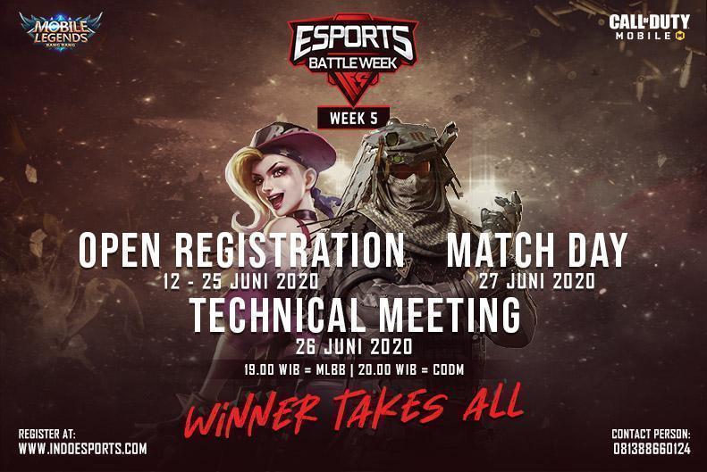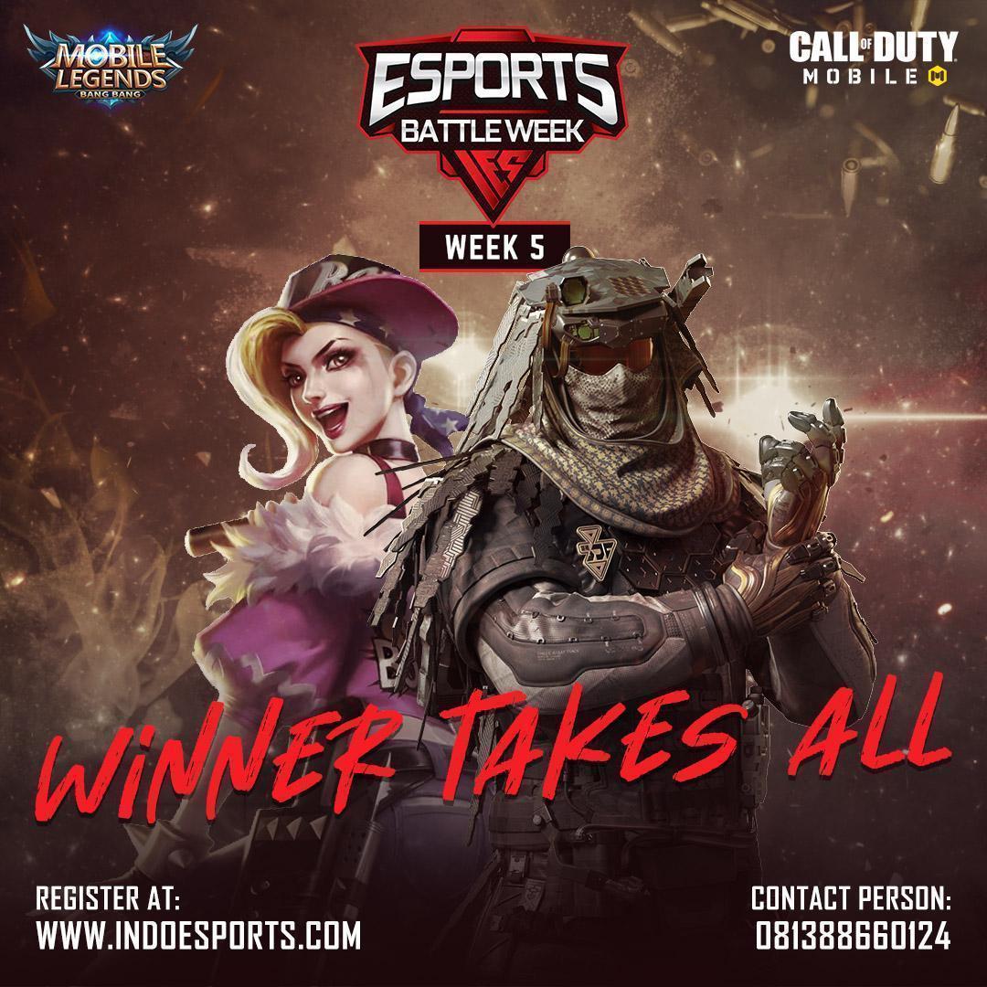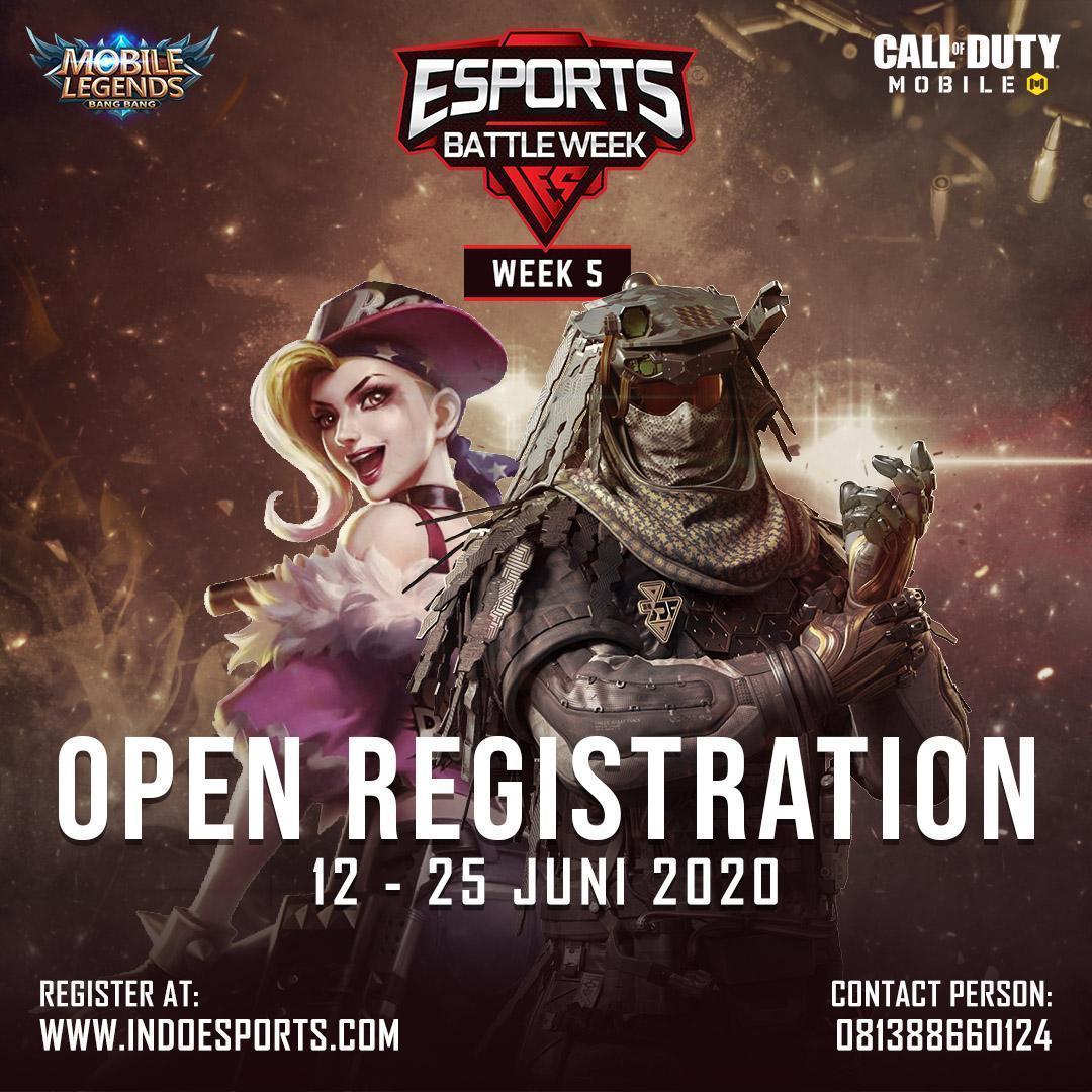 Esports Battle Week #4 mempertandingkan dua judul esports yaitu: Mobile Legends dan PUBG Mobile. Usai pertandingan yang dilakukan di pekan sebelumnya, maka Esports Battle Week #5 kini telah dibuka dengan mempertandingan 2 cabang esports lagi, yaitu: Call of Duty Mobile dan Mobile Legends: Bang Bang. Sobat gamers yang belum berhasil di minggu sebelumnya bisa kembali mengikuti kompetisi di Week #5 ini untuk unjuk kemampuan.