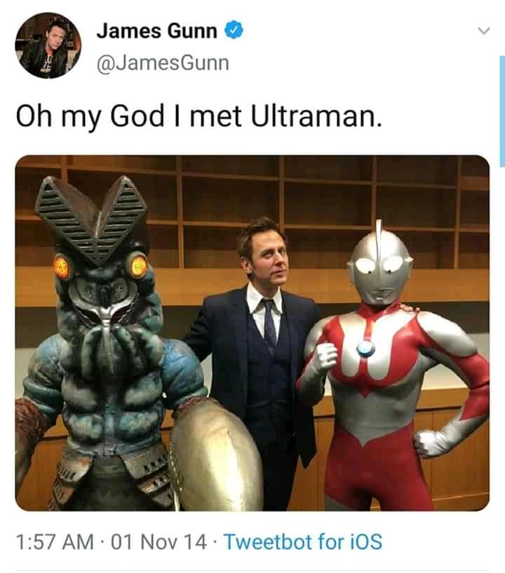 Selain seri Kamen Rider, ternyata James Gunn juga ngefans sama Ultraman. Hal ini juga terungkap saat foto tahun 2014 silam di akun twitternya yang sama. Di mana dalam foto itu, sutradara Guardian of The Galaxy ini sempat berfoto bareng dengan Kaiju Alien Baltan dan Ultraman tentunya. Foto itu diambil saat seri Ultraman sedang gencar-gencarnya tayang dan hadir di Amerika Serikat sana. Hal itu James lakukan demi mendukung acara yang digemarinya agar dikenal oleh orang-orang barat sana. Sama halnya dengan Kamen Rider, James juga melalukan twit tersebut agar fans barat tahu kalau seri Kamen Rider ternyata jugalah populer tidak kalah populernya dengan film Marvel yang dia sutradarai.