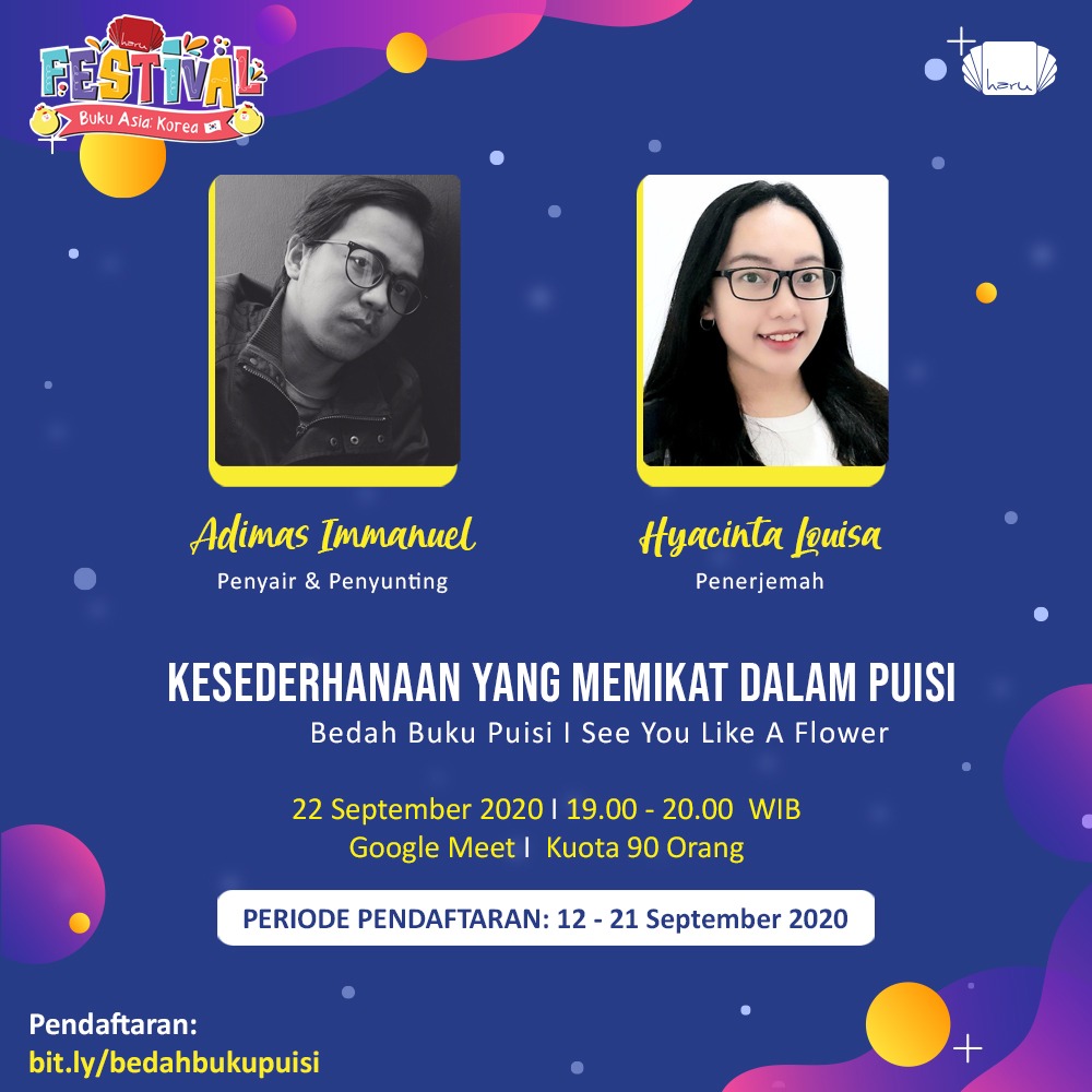 Na Tae Joo adalah penyair senior Korea Selatan yang sudah banyak menerbitkan buku kumpulan puisi dan mendapatkan berbagai penghargaan. Bersama dengan Adimas Immanuel, penyunting buku puisi I See You Like A Flower, dan Hyacinta Louisa, penerjemah, kita akan berdiskusi tentang keindahan dalam kesederhanaan yang Na Tae Joosajikan dalam karyanya ini, termasuk proses penerjemahan dan penyuntingan buku puisi I See You Like A Flower.