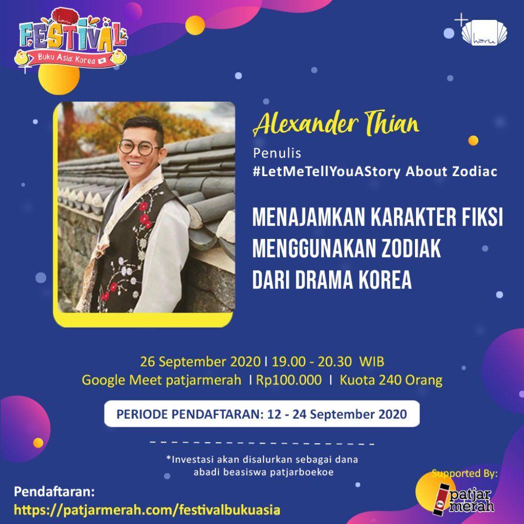 Karakter adalah salah satu elemen penting dalam fiksi, karena karakterlah yang menggerakkan cerita. Dalam talkshow ini Alexander Thian akan mengupas cara menajamkan karakter menggunakan zodiak. Kamu dapat belajar mengasah kemampuan tersebut dengan cara yang menyenangkan: membedah zodiak karakter dalam drama Korea, Reply 1988.
