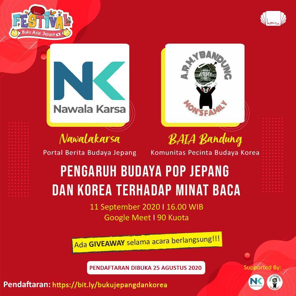 Saat ini budaya pop dari Jepang dan Korea sangat diminati masyarakat Indonesia. Berbagai produk budaya pop banyak disebarluaskan dan disambutdengan sangat baik. Namun, apakah penyebaran budaya pop tersebut berpengaruh pada minat baca para penikmat budayanya?Nawalakarsa, Baia Bandung, dan Penerbit Haru hadir untuk berbincang tentang ini. Nawalakarsa adalah portal berita yang banyak mengangkat budaya populer Jepang, sedangkan Baia Bandung adalah komunitas yang menaungi penggemar boygrup asal Korea Selatan, BTS.