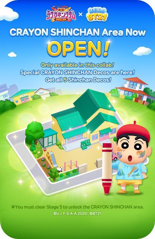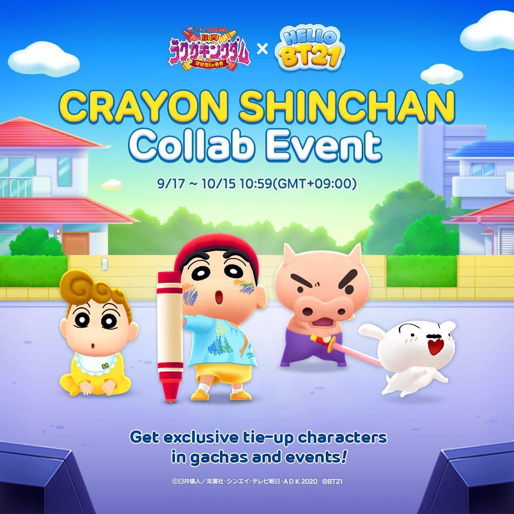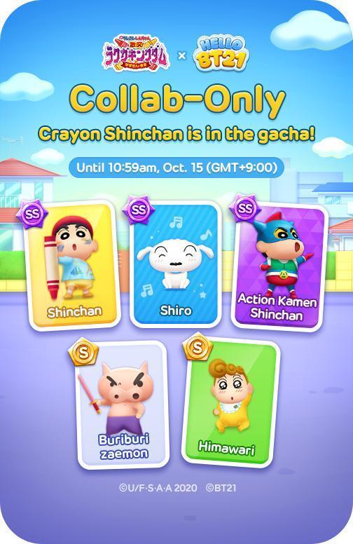Selama kolaborasi berlangsung, Shinchan, Himawari, Action Kamen Shinchan, Buriburizaemon, dan Shiro akan tersedia dari gacha. Setiap karakter akan dilengkapi dengan skill yang unik yang bisa membantu BT21! Lihat pengumuman dalam gim untuk informasi lebih lanjut.