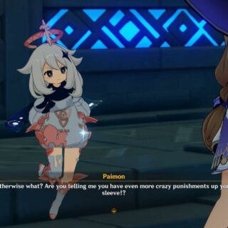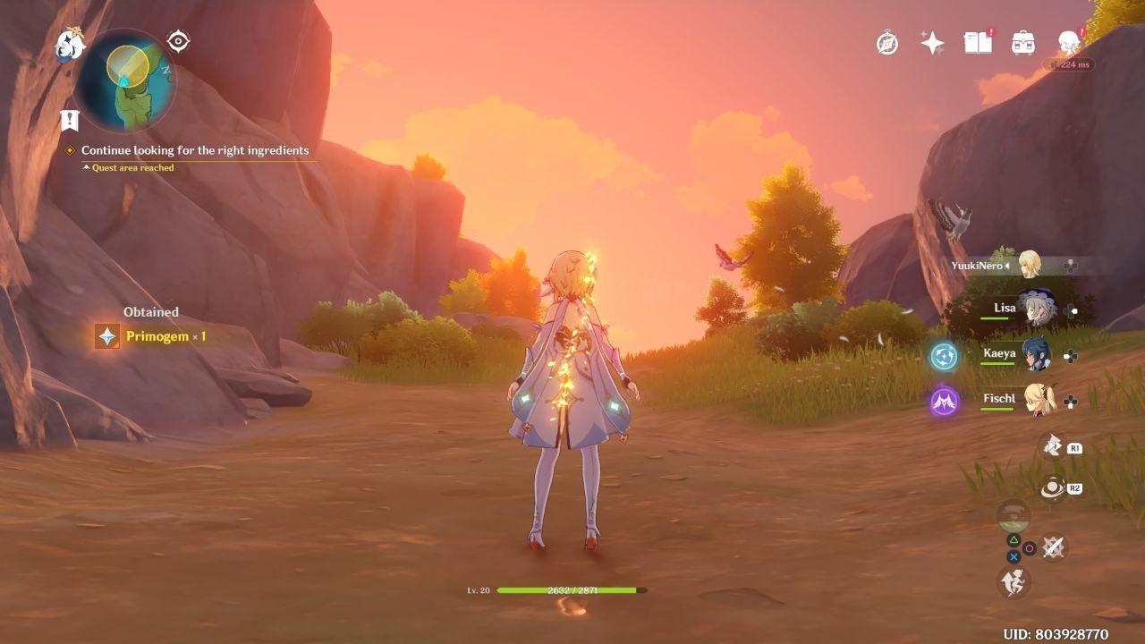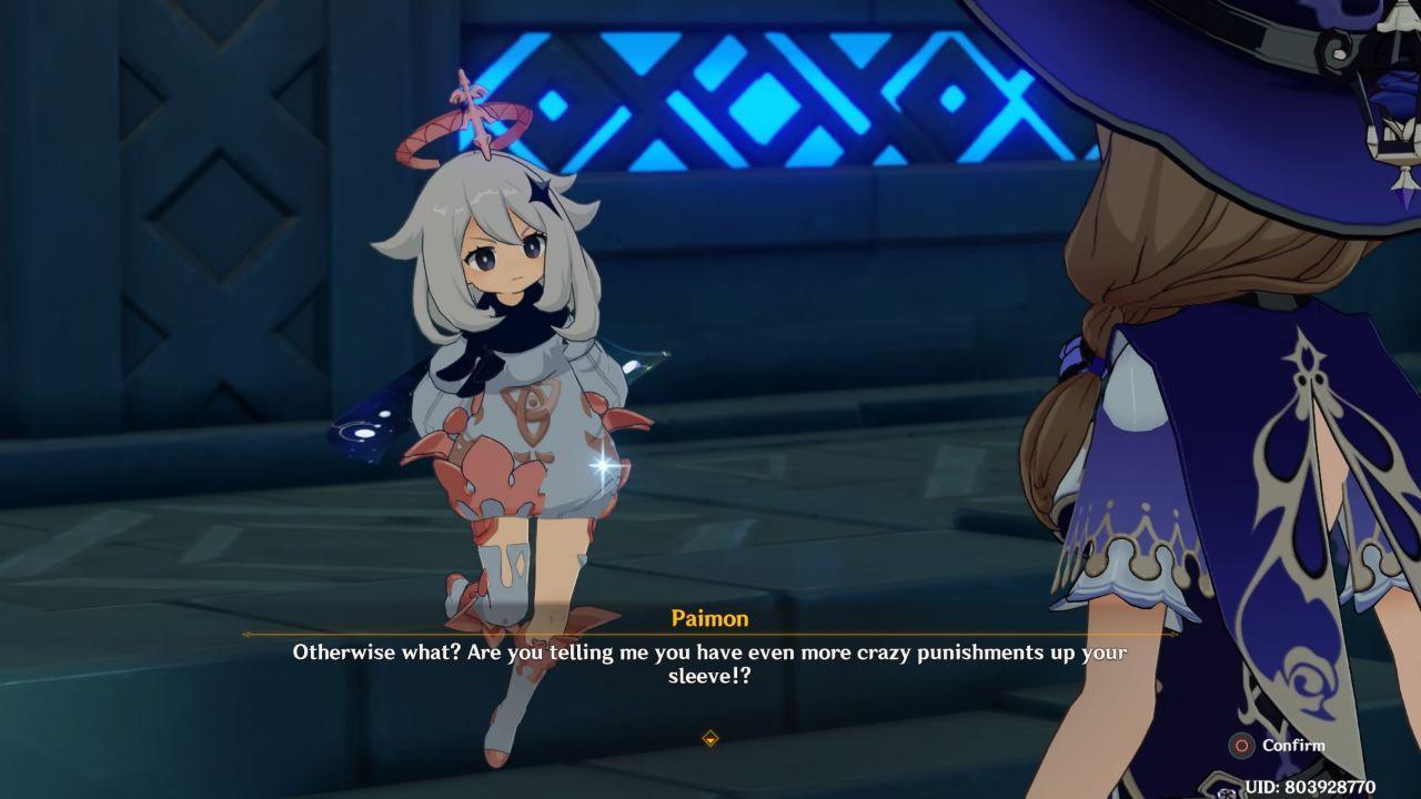 Cutscene pun berlanjut dengan adegan salah satu kakak beradik yang tidak dipilih menghilang dan karakter yang dipilih oleh pemain terdampar di sebuah pantai. Di pantai inilah pemain bertemu dengan sesosok makanan darurat pemandu perjalanan bernama Paimon yang akan memberikan tutorial dan mengantar pemain menjalani cerita dan petualangan di dunia Genshin Impact.