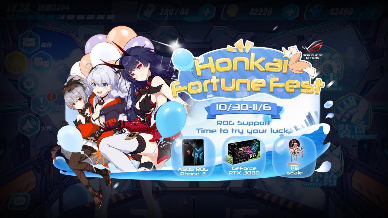 Selain itu, sebagai tanda terima kasih, undian dalam game [Honkai Fortune Fest] akan diadakan pada 30 Oktober. Pemain bisa memperoleh 12 tiket undian dengan menyelesaikan misi-misi. Daftar pemenang akan diumumkan pada 6 November. Hadiah termasuk Laptop ROG, Ponsel ROG, GeForce RTX 3080, dan figure Yae Sakura.