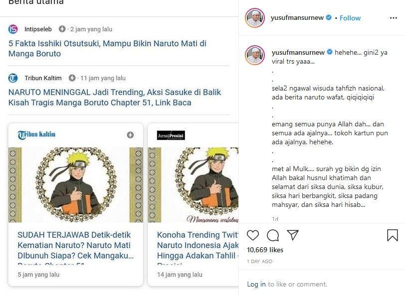 Tak tanggung-tanggung. Bahkan tokoh sekelas Ulama terkenal Ustadz Yusuf Mansurpun juga turut memberikan respon atas kabar meninggalnya Naruto ini. Dituturkan melalui akun instagramnya, Ustadz Yusuf Mansur menuturkan bahwa memang segala yang ada di dunia ini adalah milik Allah, dan akan kembali kepadanya, bahkan tokoh kartun seperti Narutopun juga ada ajalnya. Lebih jauh, Ustadz Yusuf Mansur juga mendoakan semoga sang ninja meninggal dalam keadaan Husnul Khatimah dan selamat dari siksa dunia, siksa kubur, siksa hari berbangkit, siksa padang mahsyar, dan siksa hari hisab.