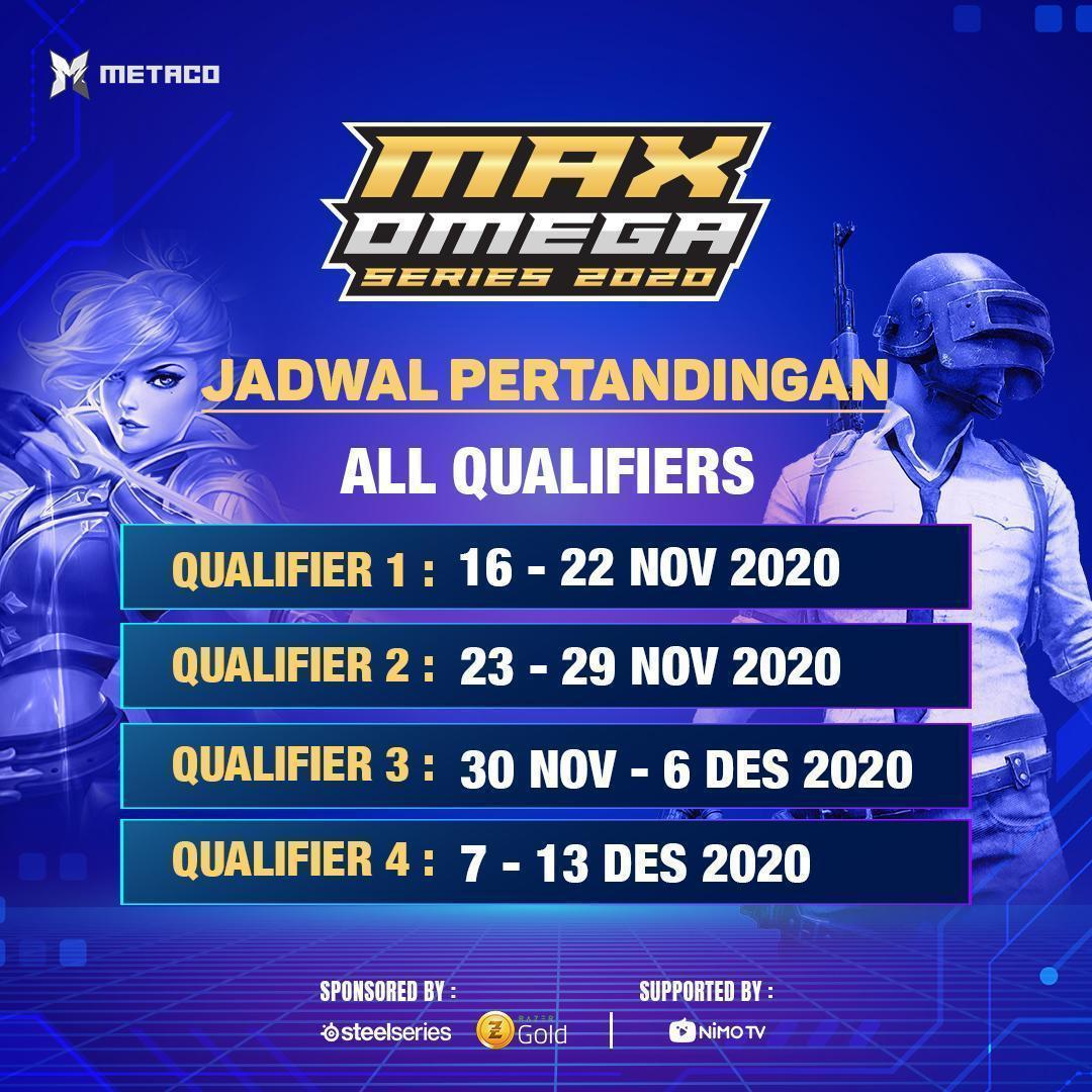 Pendaftaran MAX Omega Series sudah dibuka sejak 26 Oktober 2020 hingga 30 November 2020. Pada cabang Mobile Legends Bang Bang, MAX Omega Series akan menjaring 256 tim yang bakal dibagi ke 4 kualifikasi yang berbeda. Sementara PUBG Mobile akan menjaring 1600 tim yang juga bakal dibagi ke 4 kualifikasi yang berbeda.